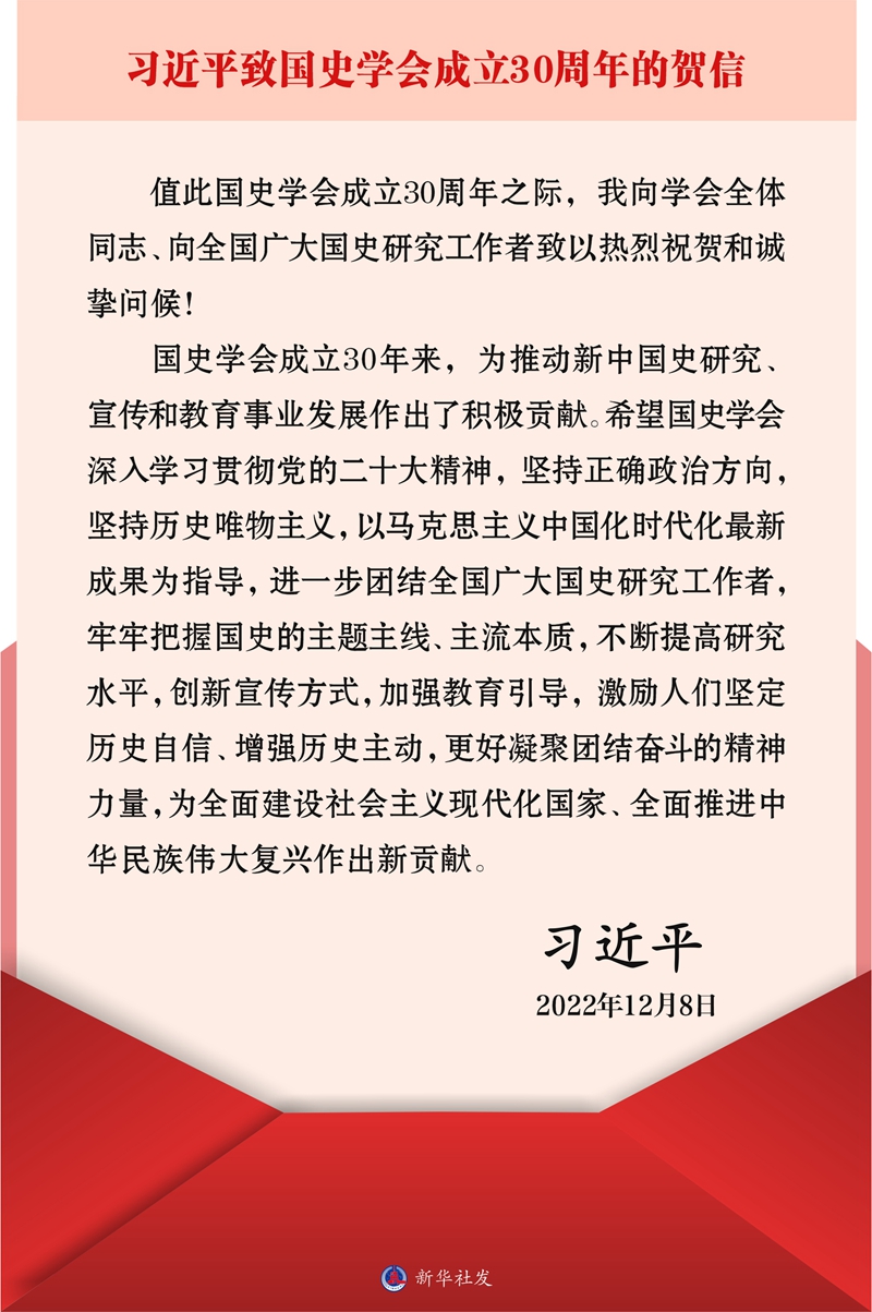 在中華人民共和國國史學會成立30周年之際,中共中央總書記、國家主席、中央軍委主席習近平發(fā)來賀信,向?qū)W會全體同志、向全國廣大國史研究工作者致以熱烈祝賀和誠摯問候。