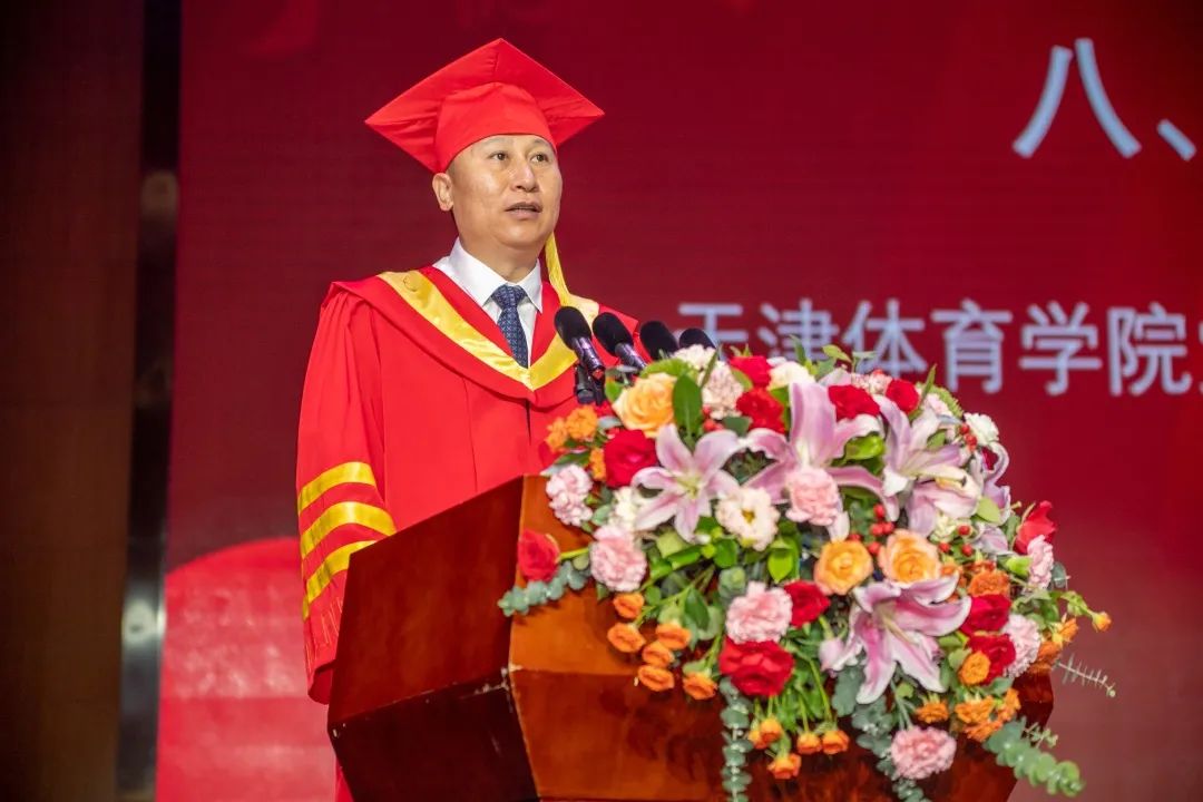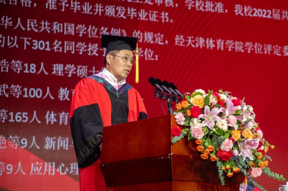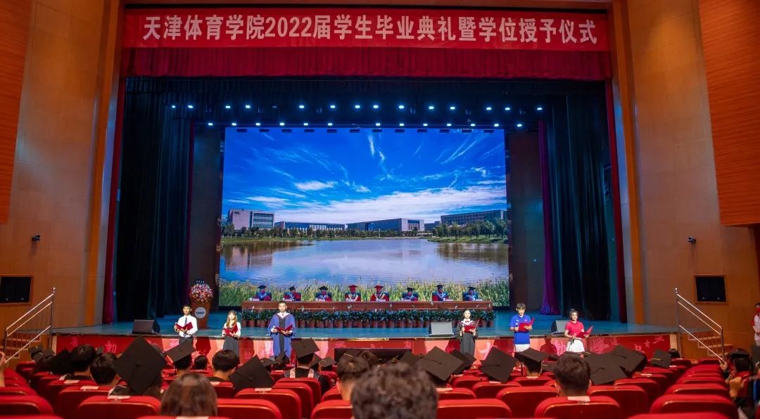 青春獻(xiàn)禮二十大,踔厲奮發(fā)向未來(lái)。天津體育學(xué)院2022屆學(xué)生畢業(yè)典禮暨學(xué)位授予儀式于2022年6月28日在大學(xué)生活動(dòng)中心報(bào)告廳隆重舉行。天津體育學(xué)院黨委書(shū)記張立順,黨委副書(shū)記、院長(zhǎng)張欣,黨委常委、副院長(zhǎng)宋愛(ài)軍,黨委常委、市紀(jì)委監(jiān)委駐天津體育學(xué)院紀(jì)檢監(jiān)察組組長(zhǎng)張洺濤,黨委常委、組織部部長(zhǎng)葉加寶,黨委常委、宣傳部部長(zhǎng)劉原,黨委常委、統(tǒng)戰(zhàn)部部長(zhǎng)依惠琴出席畢業(yè)典禮。學(xué)校各黨政部門(mén)、教輔單位主要負(fù)責(zé)同志,各二級(jí)教學(xué)單位全體班子成員,全體教研室主任、研究生導(dǎo)師、輔導(dǎo)員,以及全體2022屆畢業(yè)生在線下和“云端”齊聚一堂,共同歡慶畢業(yè)盛典。畢業(yè)典禮由黨委常委、副院長(zhǎng)張衛(wèi)國(guó)主持。