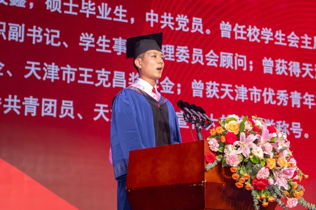 研究生畢業(yè)生代表程俊鑫在發(fā)言中回顧了自己在天體度過(guò)的七載春秋,并帶領(lǐng)全體畢業(yè)生莊嚴(yán)宣誓,號(hào)召大家勇?lián)w育強(qiáng)國(guó)使命,肩負(fù)民族復(fù)興重任。