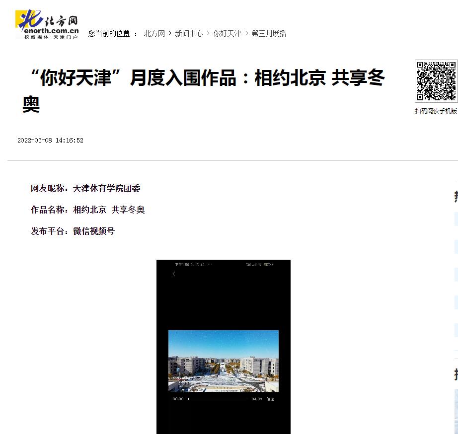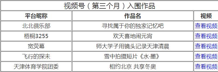 日前,經抖音、快手、微信視頻號、新浪微博、津抖云五個平臺按照“網絡熱度”的推薦,由評委會進行評分,“你好,天津”網絡短視頻大賽最終確定210個作品入圍第三個月賽。我校團委微信視頻號參賽作品《相約北京、共享冬奧》入圍。