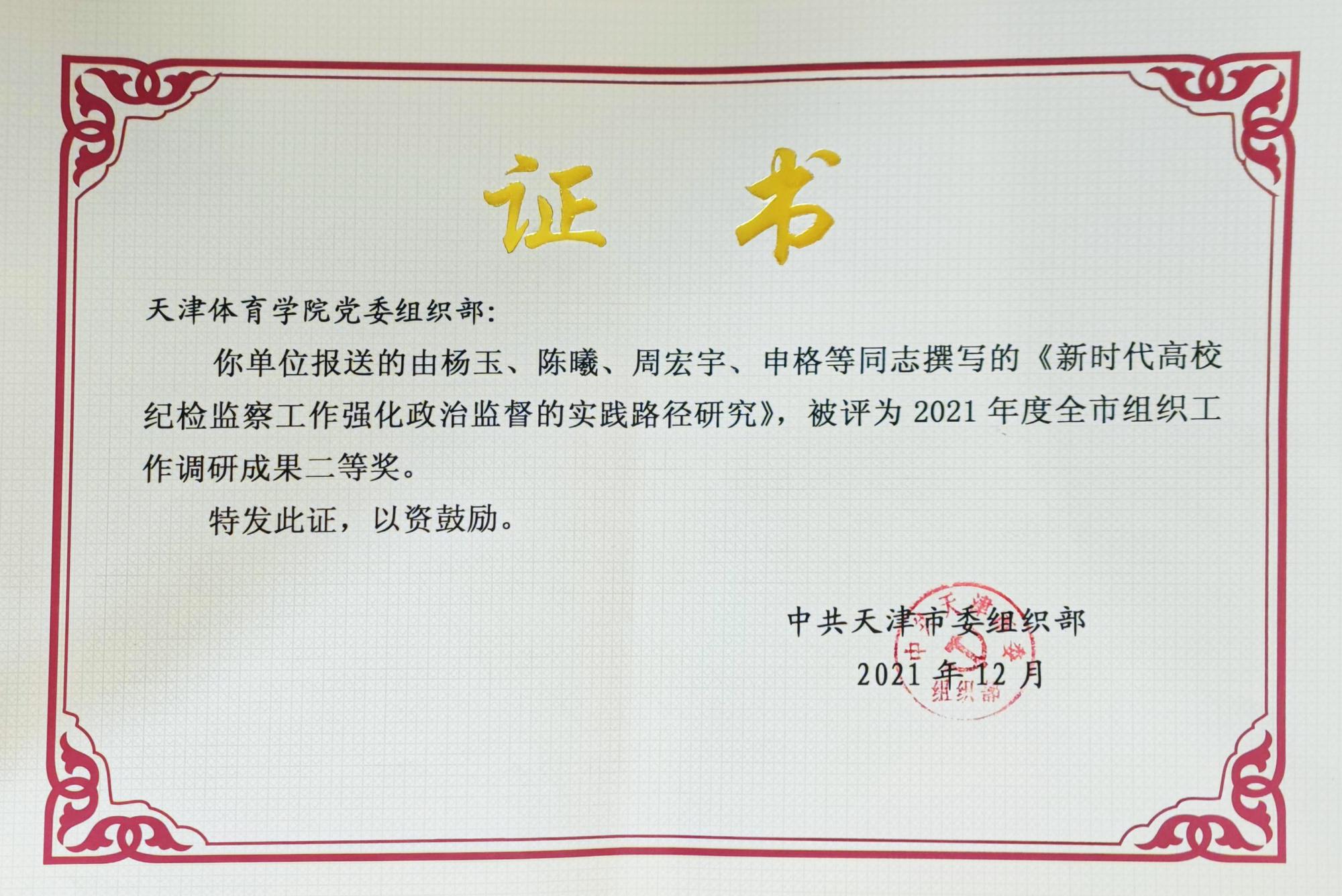 日前,市委組織部公布2021年度全市組織工作課題調(diào)研成果獲獎情況,我校社會體育與健康科學學院黨委副書記、紀委書記楊玉同志作為課題負責人上報的《新時代高校紀檢監(jiān)察工作強化政治監(jiān)督的實踐路徑研究》,榮獲天津市2021年度組織工作調(diào)研成果二等獎。