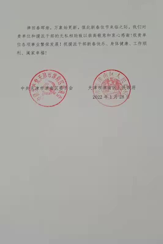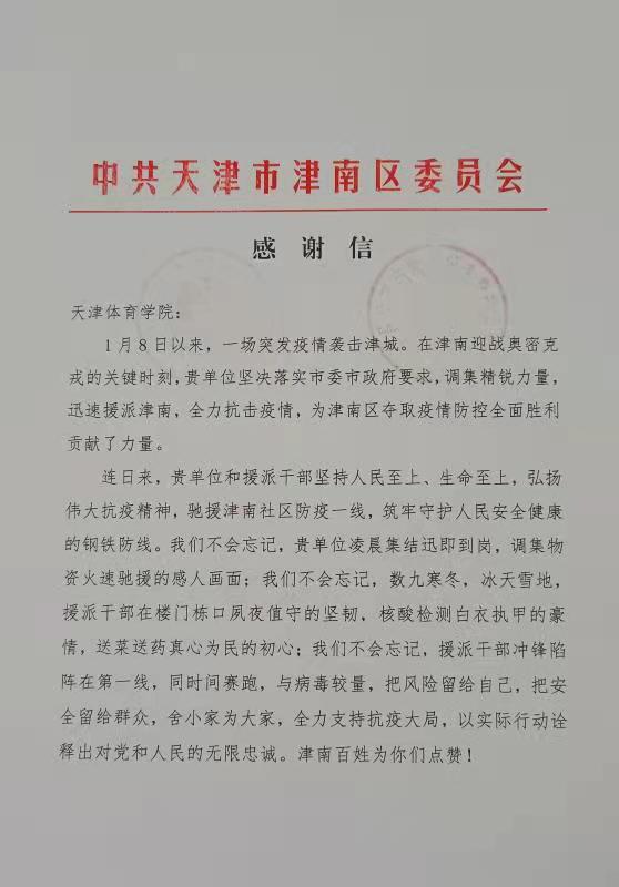 近日,中共天津市津南區委員會、天津市津南區人民政府向我校發來感謝信,對我校和援派干部堅決落實市委市政府要求,迅速馳援津南防疫一線,全力支持抗疫大局致以崇高敬意和衷心感謝。