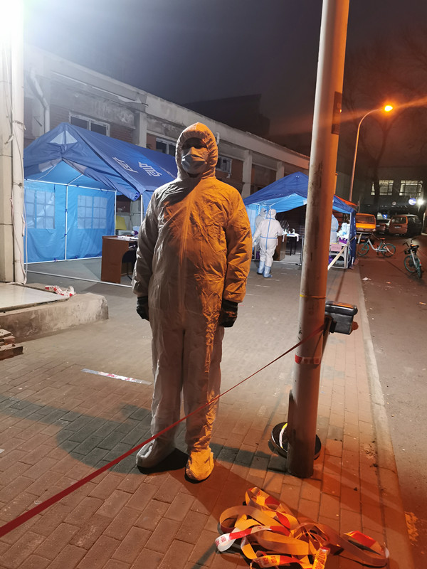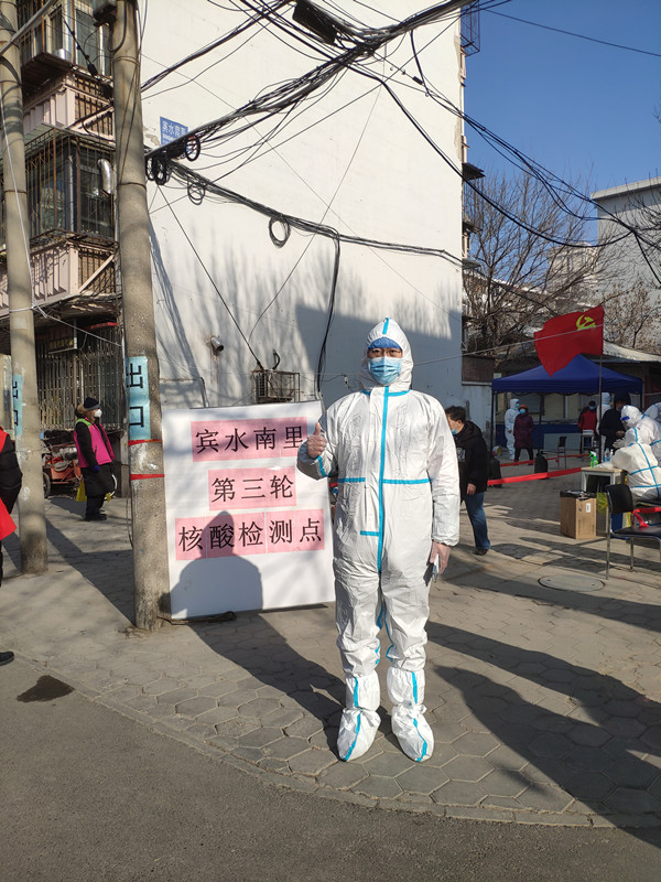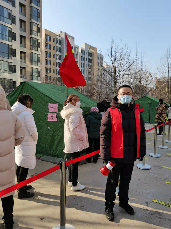 程鵬舉,中共黨員,機關黨委組織員,參加西青區精武鎮燕南園社區核酸篩查志愿服務,主動到社區報到,逐樓逐戶通知居民有序進行核酸篩查,在篩查現場維持秩序、核驗健康碼,及時協助老人小孩等特殊人群走綠色通道進行檢測。