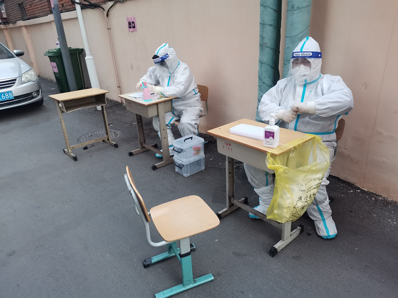 蘆劼明,學(xué)院辦公室副主任,在河?xùn)|區(qū)春華街道華康里社區(qū)篩查點(diǎn),負(fù)責(zé)樣品登記、裝袋、轉(zhuǎn)運(yùn)等工作。