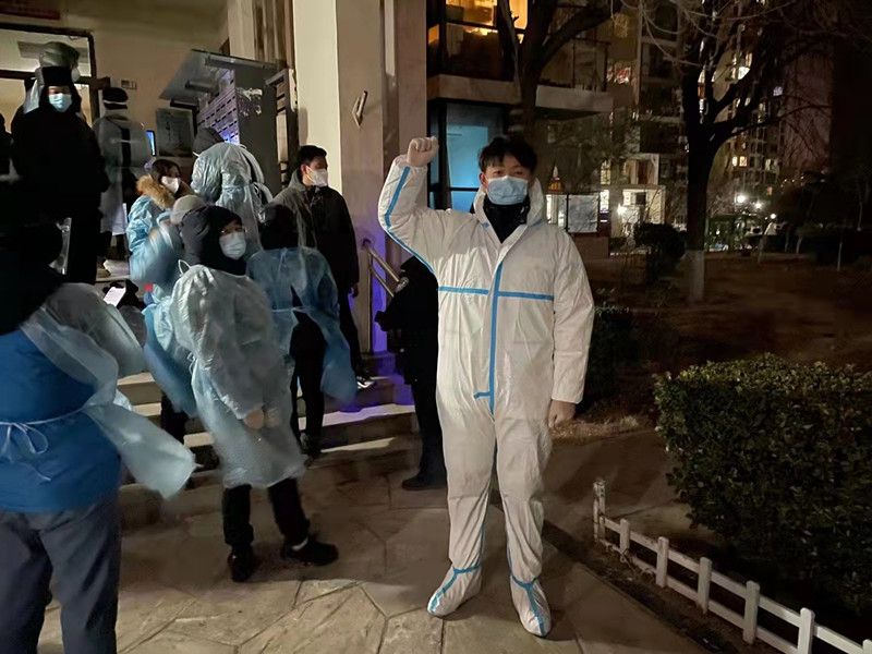 張鵬遠,中共黨員,輔導員,在西青區精武鎮旭輝燕南園負責居民掃碼登記和核酸檢測現場秩序維護。