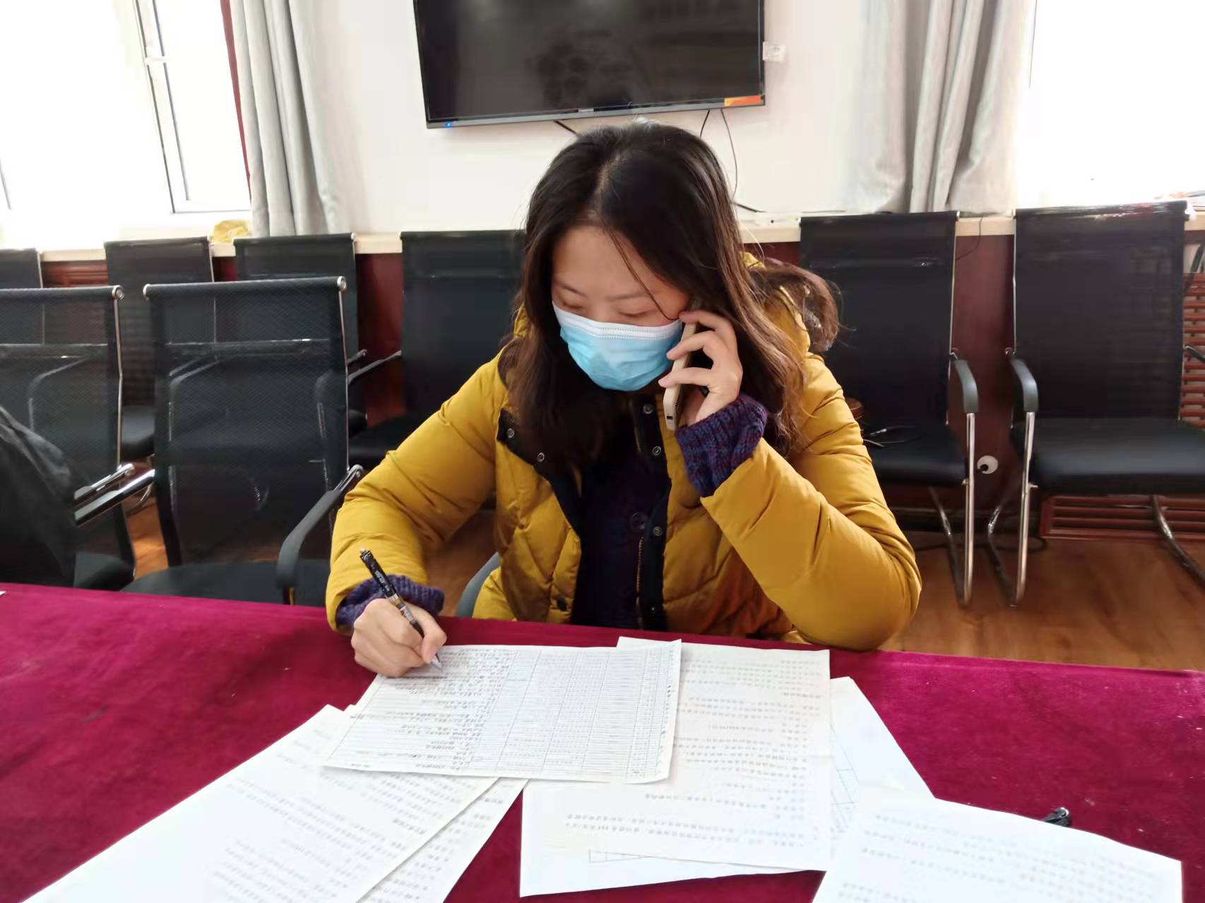 楊詩云,文化與藝術(shù)教研室教師,在南開區(qū)水上公園街道開展電話收集、核對未參加核酸篩查居民信息工作。