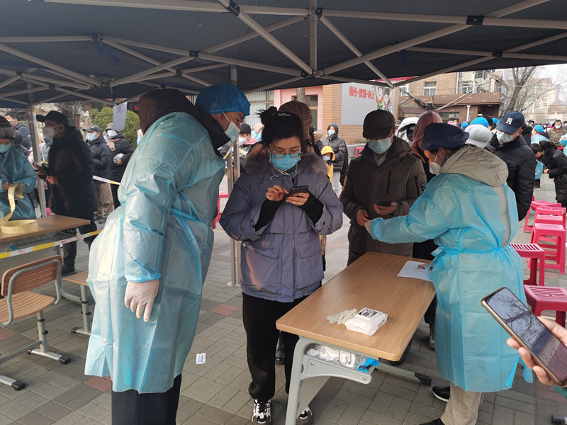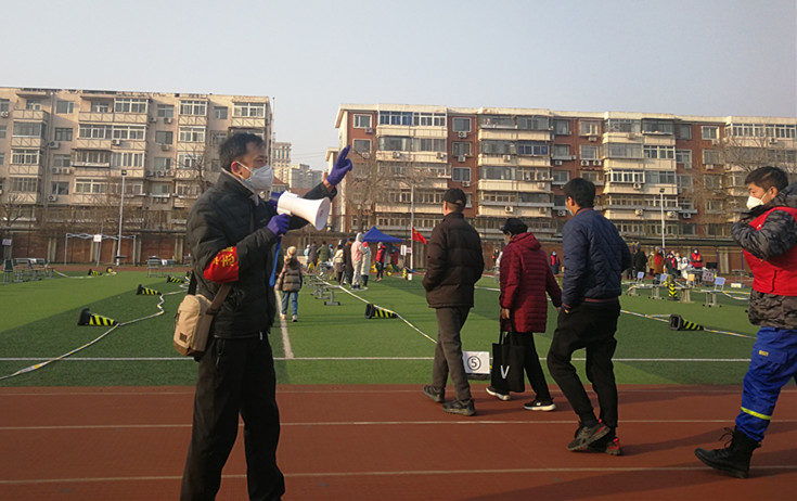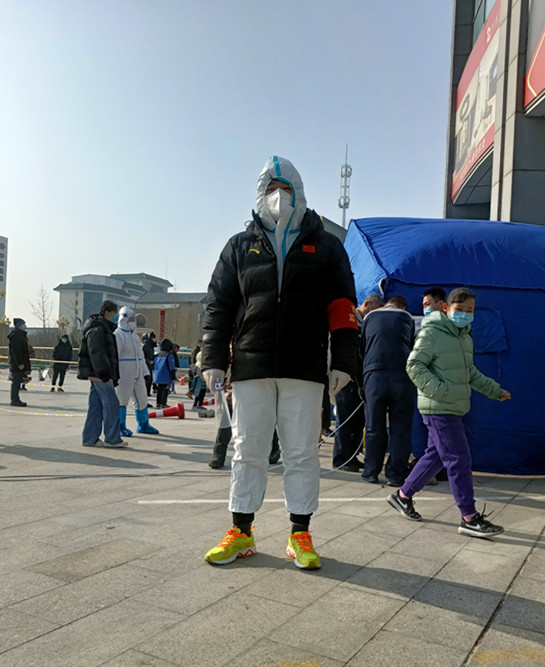 王曉楠,武術(shù)教研室教師,在南開區(qū)體育中心街龍濱園社區(qū)協(xié)助開展全員核酸檢測現(xiàn)場掃碼登記、秩序維護工作。