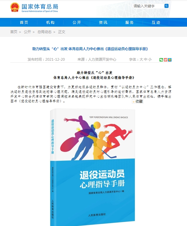 近日,在全面貫徹落實黨的十九屆六中全會精神、提高新時代體育發展質量效益的背景下,國家體育總局官方網站發布消息,由國家體育總局人力資源開發中心聯合我校運動訓練科學學院心理調控與卓越表現研究中心主任胡詠梅團隊和人民體育出版社,攜手推出的圖書《退役運動員心理指導手冊》出版。該手冊是我國退役運動員轉型心理健康教育工作指定用書,旨在在新時代體育強國建設背景下,更好地服務運動員群體,貫徹“以運動員為中心”工作理念,解決運動員退役后的心理問題,滿足退役運動員對心理引導的迫切需求。
