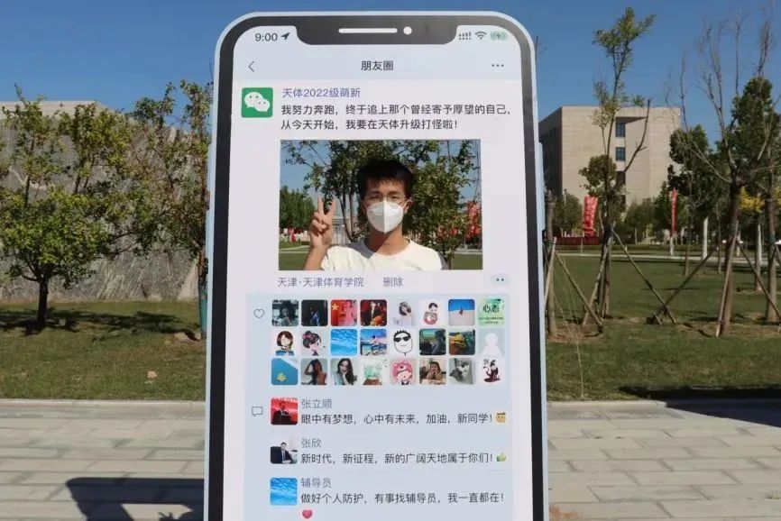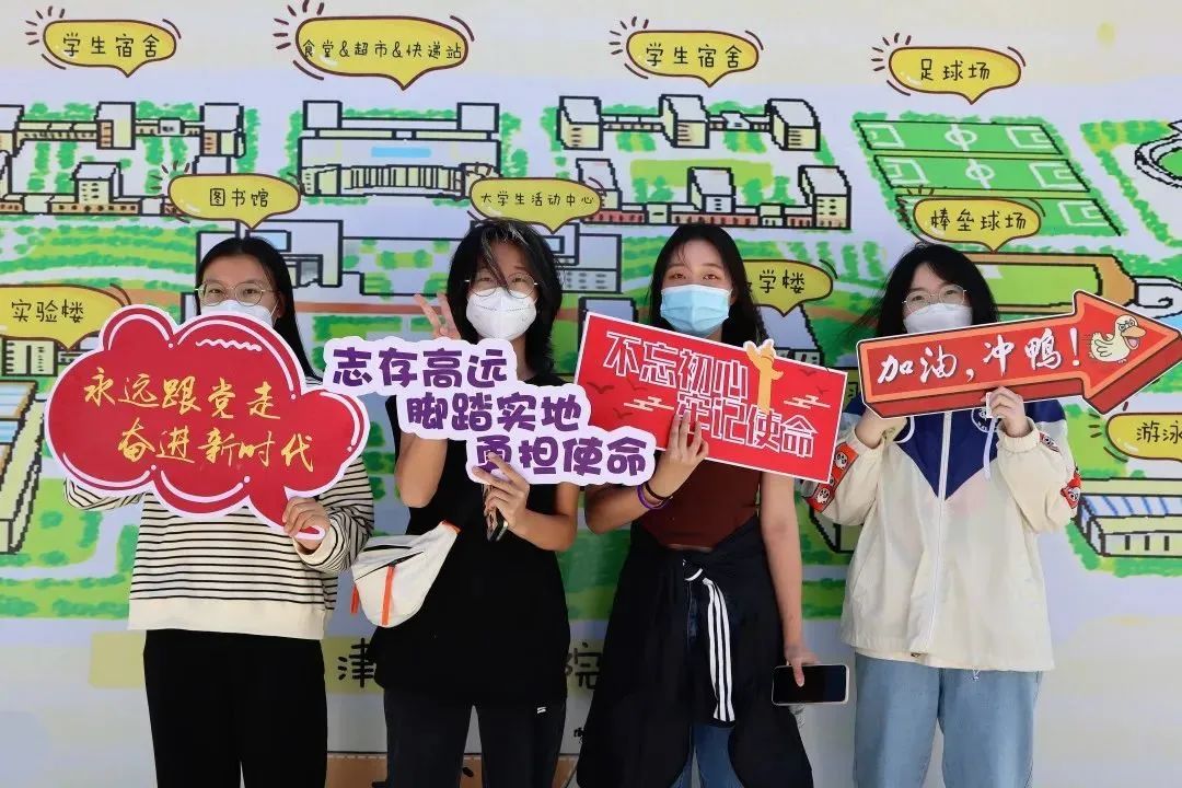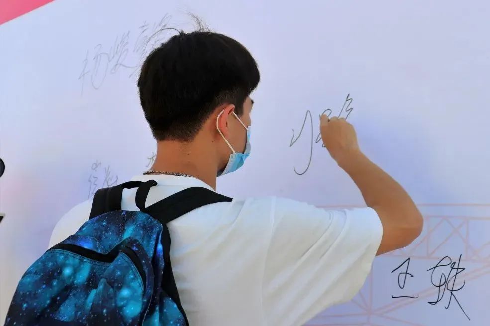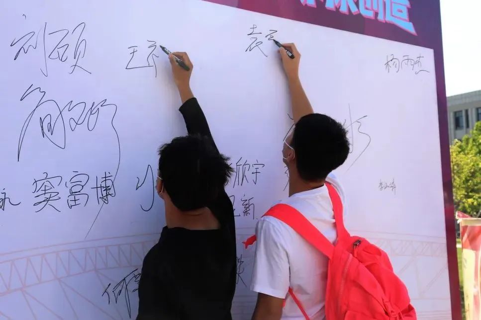 迎新現(xiàn)場秩序井然,展板、道旗、電子屏、指示牌、簽字板一應(yīng)俱全。新生們紛紛在簽字板上寫下對(duì)自己大學(xué)生活的祝福與期許,在展板前拍照定格自己初入天體的難忘時(shí)刻。