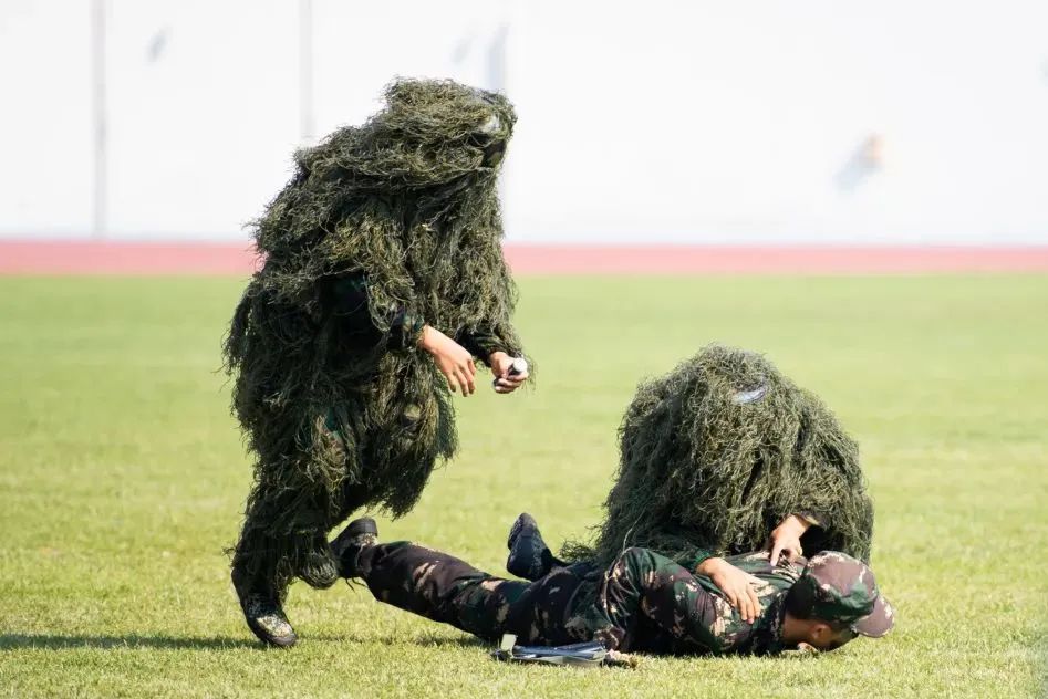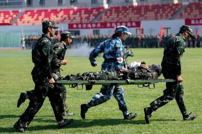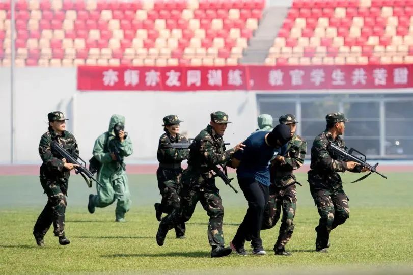 大會在雄壯的國歌聲中拉開序幕。伴隨著《分列式進行曲》,三軍儀仗隊和16個連隊的千余名2022級新生,依次走過主席臺接受檢閱。同學們步伐堅定整齊、軍姿颯爽挺拔、口號剛毅嘹亮、精神昂揚飽滿,全面展示了軍訓成果。2022級本科生軍訓團摔擒方隊與戰術方隊進行了軍事技能表演。他們巧妙地將捕俘拳、打背包、戰術對抗、核生化防護及戰場救護等軍事技能展示,與疫情防控演練相結合,展現了天體學子情系國防、榮校報國的使命擔當。