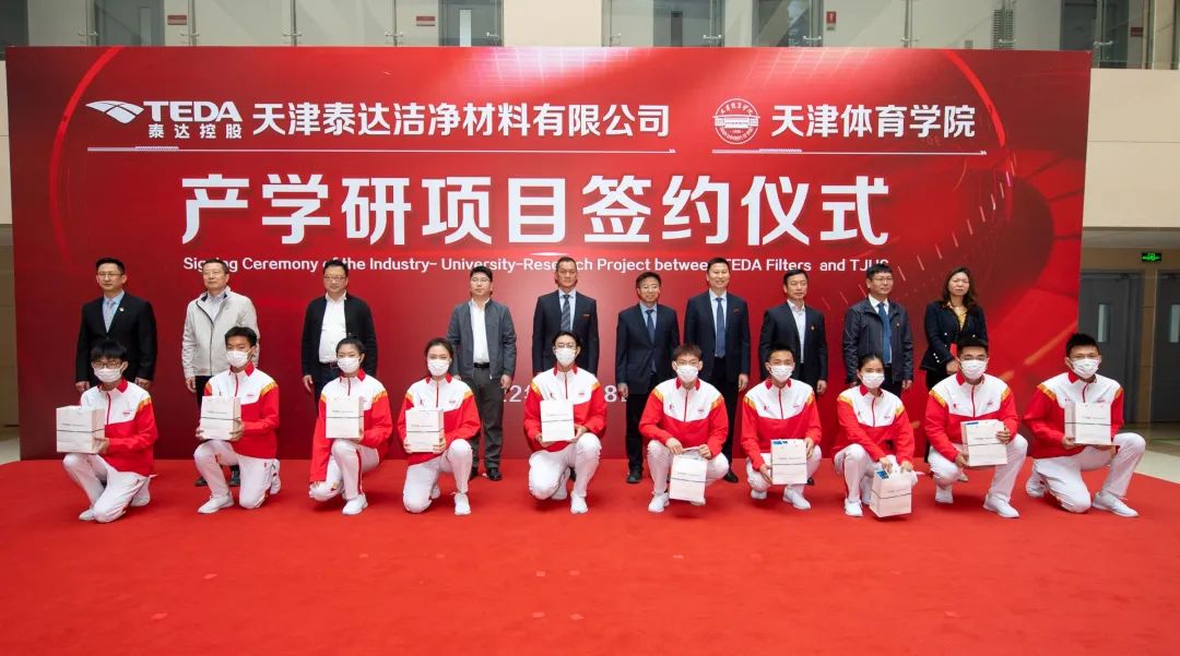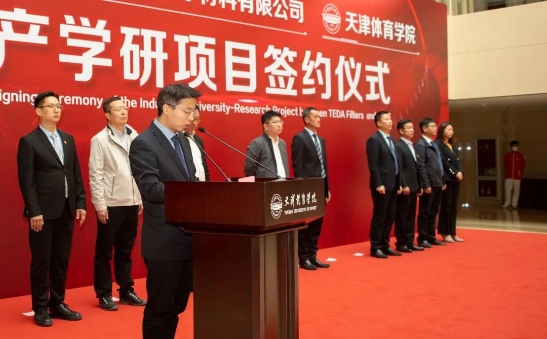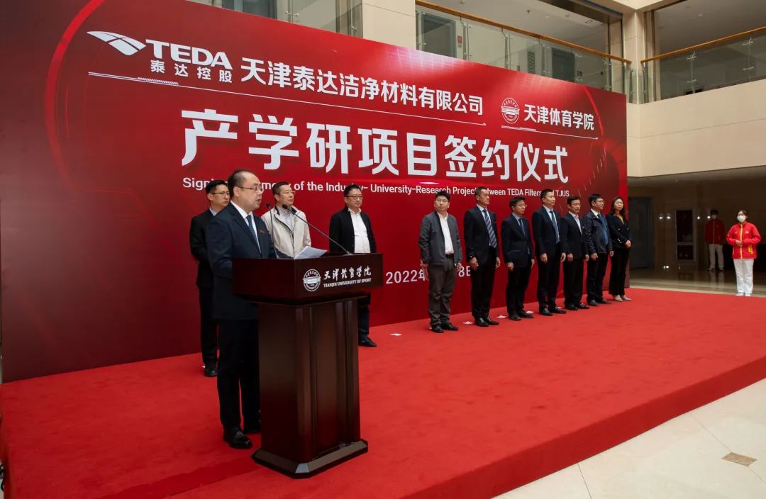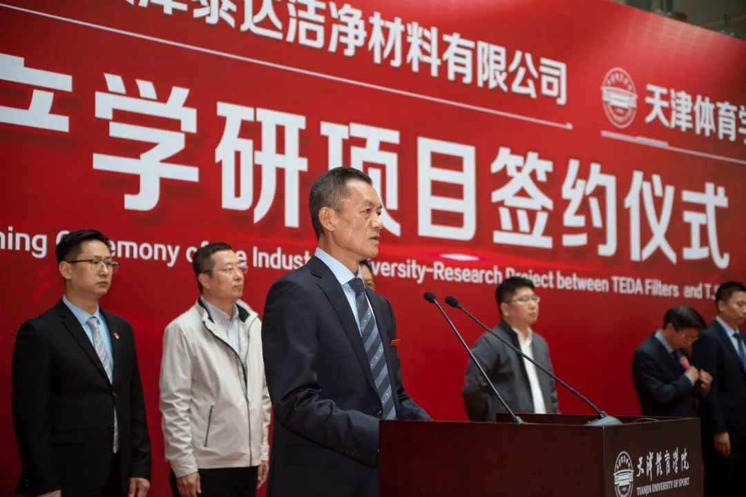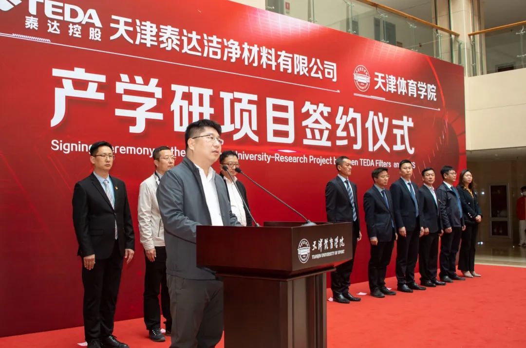 天津泰達股份有限公司黨委書記、董事長張旺在致辭中表示,天津體育學院與天津紡織集團和泰達潔凈,就運動口罩研發開展了產學研用合作,通過三方努力,在運動口罩研發方面取得了明顯的成果。產學研成果將對于完善我國防疫口罩評價標準,滿足運動場景的防疫需求,提高天津市在口罩領域的整體創新能力及核心競爭力方面發揮重要的推動作用。此次運動口罩的研發,大幅度提高了運動健兒佩戴口罩的呼吸舒暢度及舒適性,為疫情防控常態化下的呼吸健康提供了更專業的防護和保護。泰達潔凈材料有限公司與天津體育學院,將深化校企合作體制創新,為科學研究、成果轉化發揮積極作用,為區域經濟社會發展提供強有力的科技支撐。