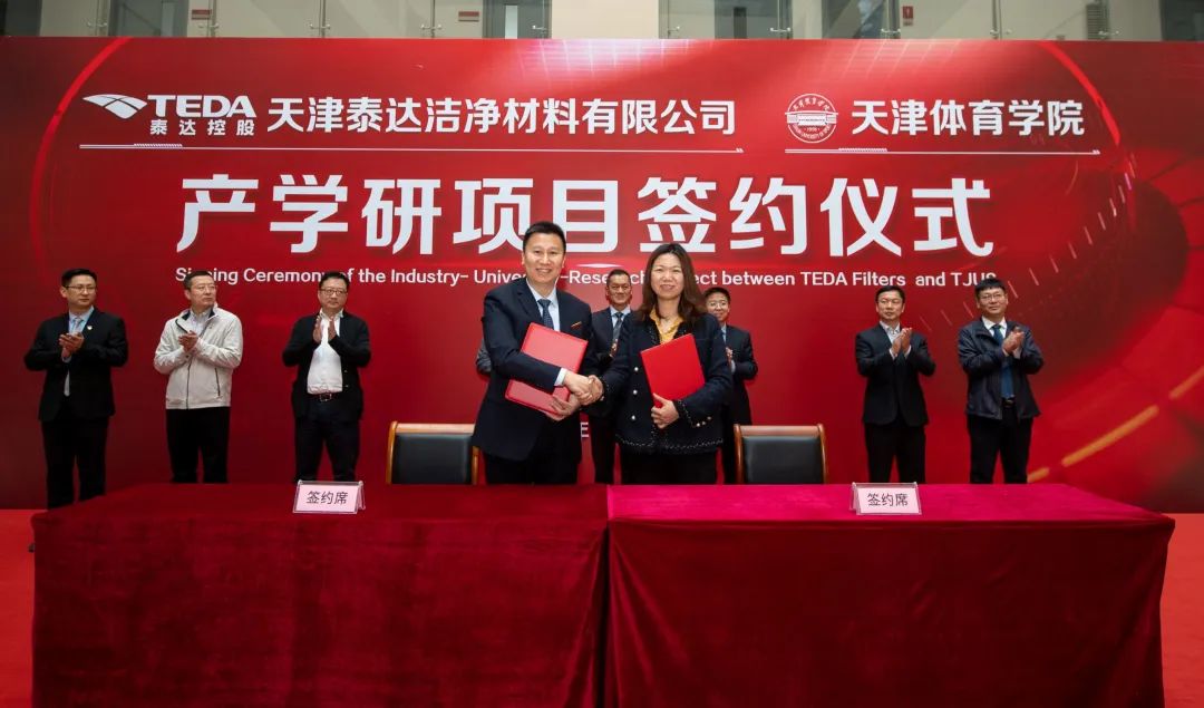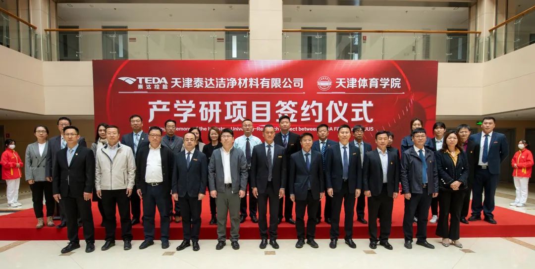 2022年10月18日,天津體育學院與天津泰達潔凈材料有限公司產學研項目簽約儀式在我校團泊校區乒羽館舉行。天津紡織集團(控股)有限公司總經理葛傳兵,天津泰達股份有限公司黨委書記、董事長張旺,黨委副書記孫國強,副總經理馬劍,天津泰達潔凈材料有限公司黨支部書記、董事長宋逍,天紡標檢測認證股份有限公司總經理呂剛,天津泰達潔凈材料有限公司總經理謝敬偉、財務總監鄭天岳,天津體育學院黨委書記張立順,黨委副書記、院長張欣,以及天津體育學院相關職能部門、二級學院負責人出席簽約儀式。簽約儀式由天津體育學院黨委副書記宋愛軍主持。