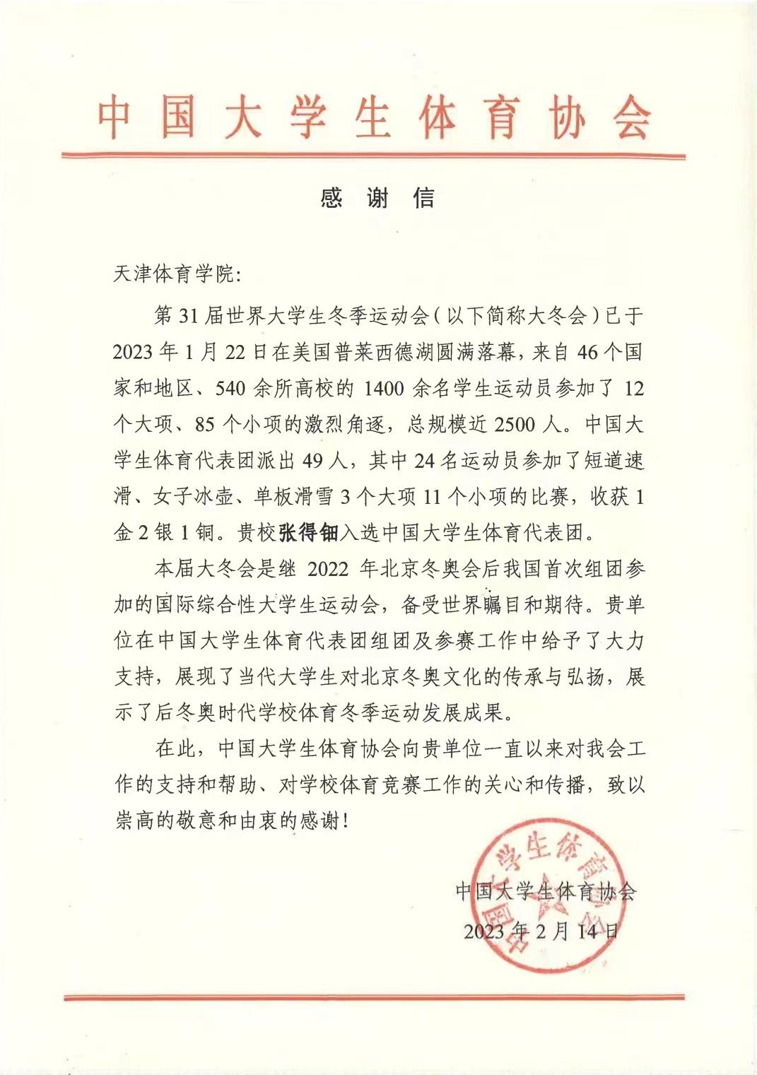 近日,中國大學生體育協會給我校發來感謝信,感謝我校培養的競技運動學院2021級學生張得鈿入選中國大學生體育代表團。