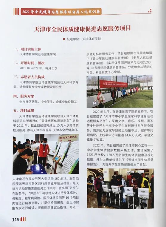 近日,由國(guó)家體育總局群眾體育司組織開展的2022年全民健身志愿服務(wù)項(xiàng)目庫(kù)征集活動(dòng)評(píng)選結(jié)果發(fā)布,我校運(yùn)動(dòng)健康學(xué)院申報(bào)的“天津市全民體質(zhì)健康促進(jìn)志愿服務(wù)項(xiàng)目”入選。