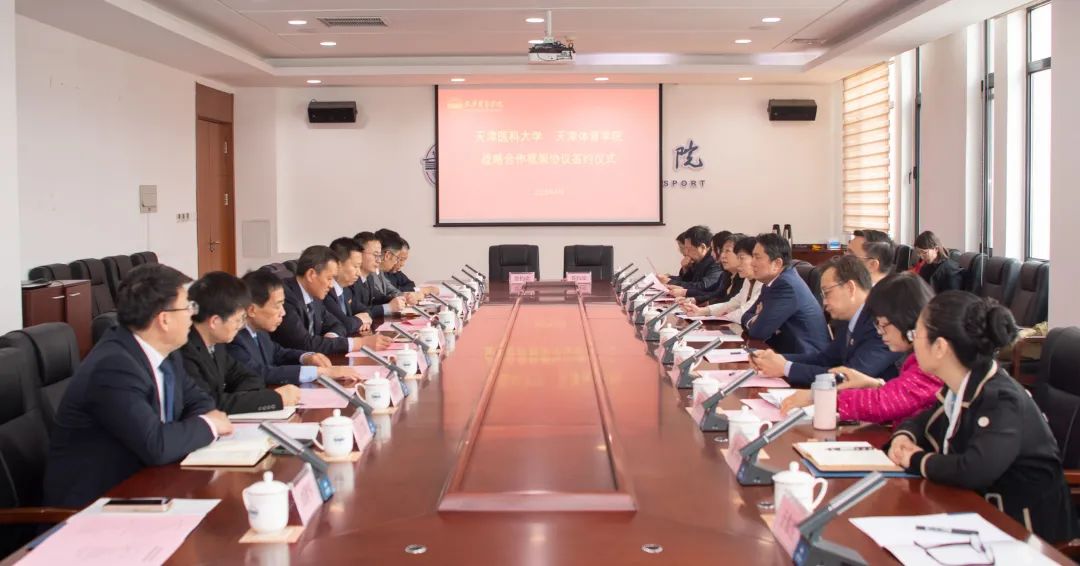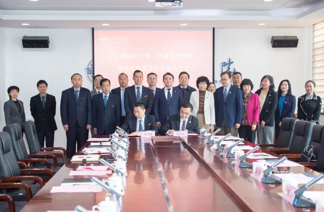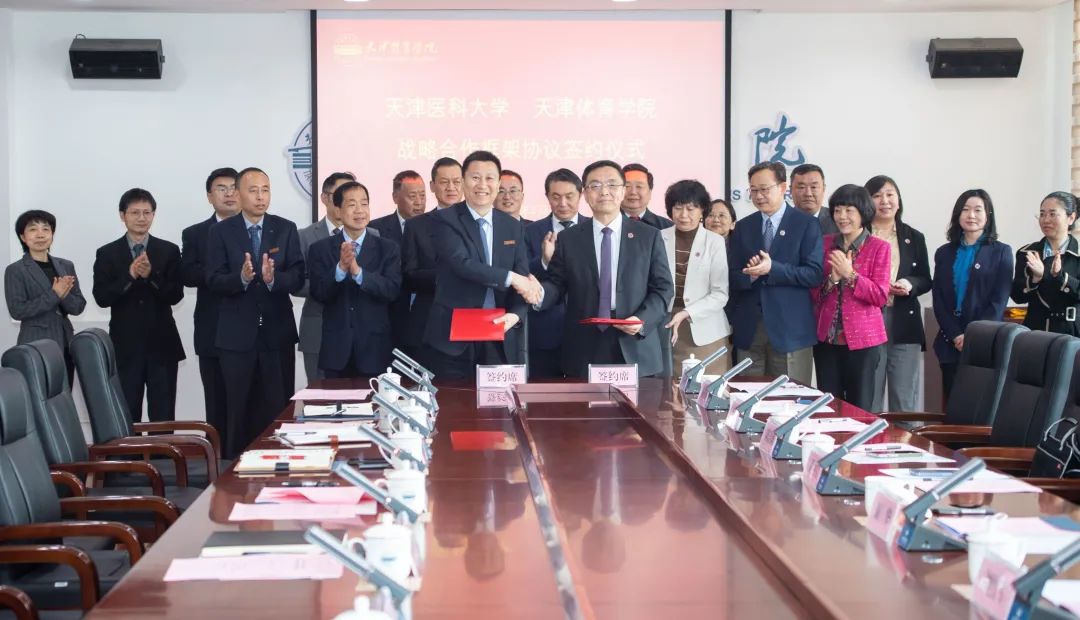 在與會人員共同見證下,天津醫科大學黨委副書記劉紅軍,天津體育學院黨委副書記、院長張欣代表兩校簽署協議。