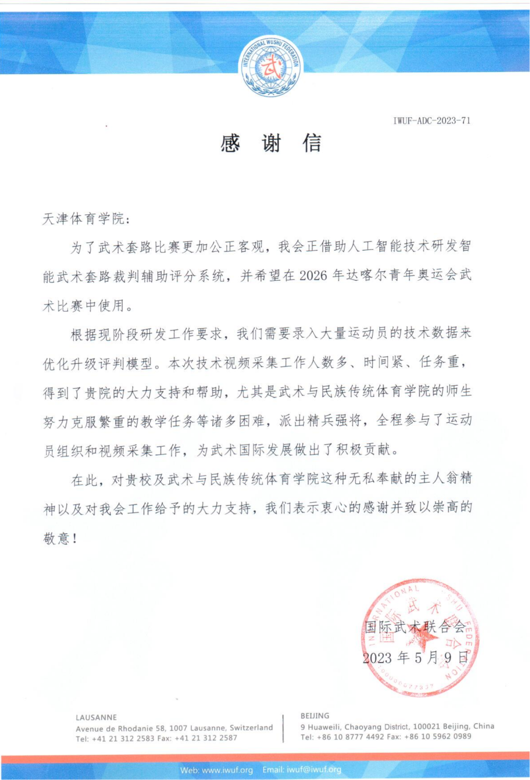 近日,國際武術聯合會給我校發來感謝信,對我校武術與民族傳統體育學院參與智能武術套路裁判輔助評分系統相關建設工作表示感謝。