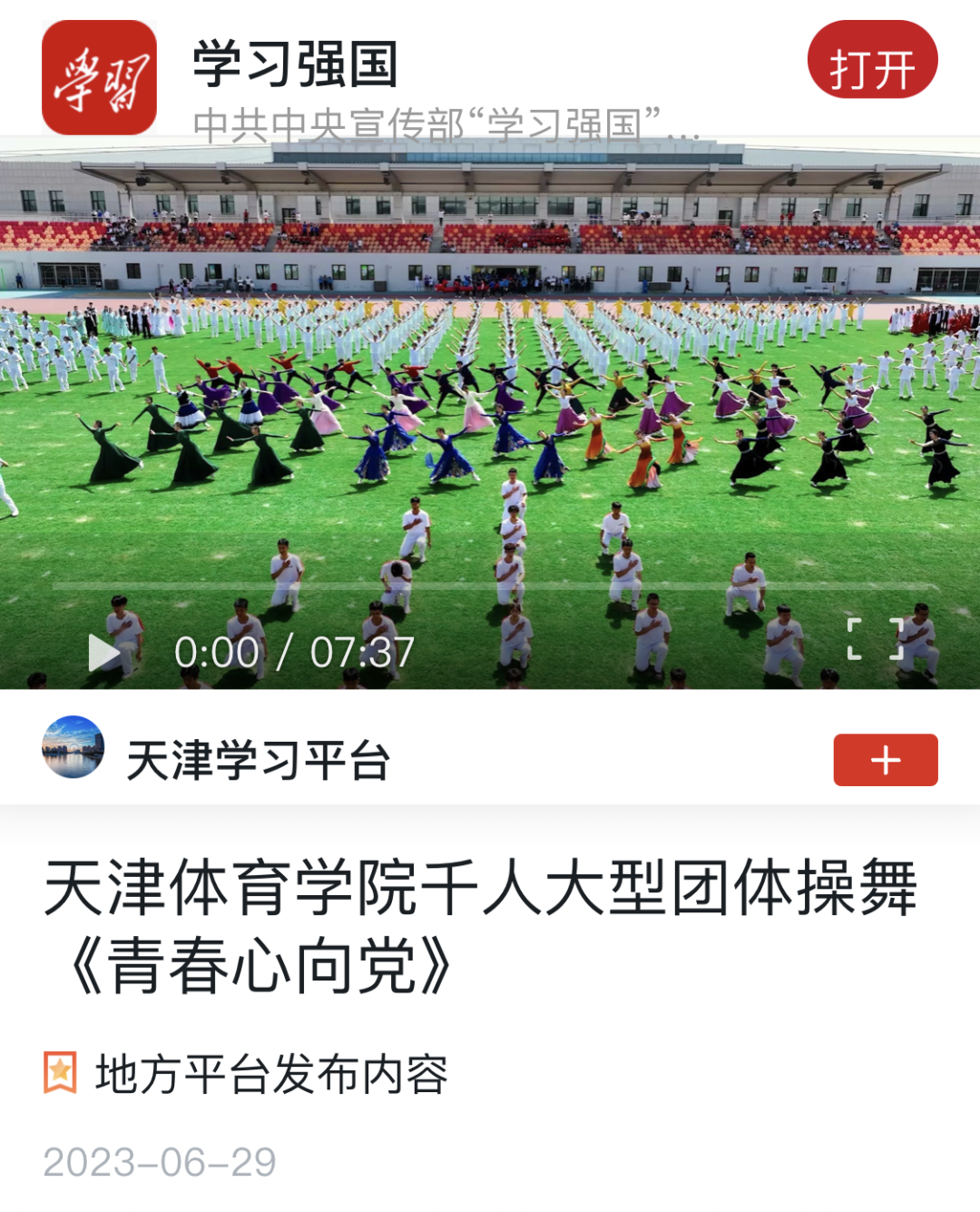 6月29日,學(xué)習(xí)強(qiáng)國(guó)天津?qū)W習(xí)平臺(tái)播發(fā)我校千人大型團(tuán)體操舞《青春心向黨》。