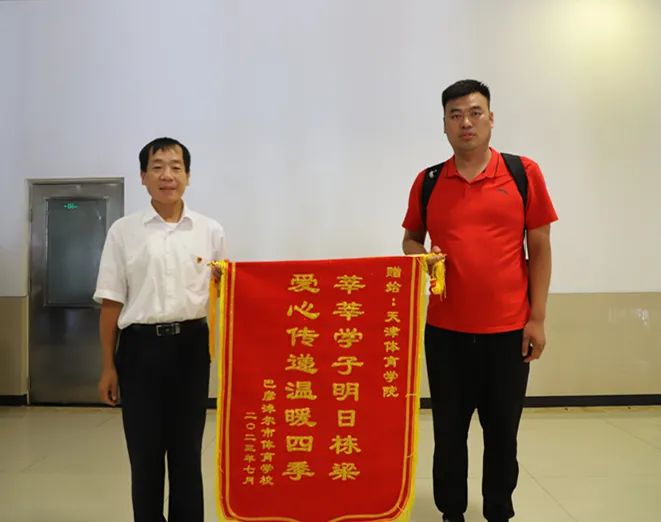 帶隊教師徐福振向張衛國轉交了巴彥淖爾市支教學校向我校贈送的錦旗。