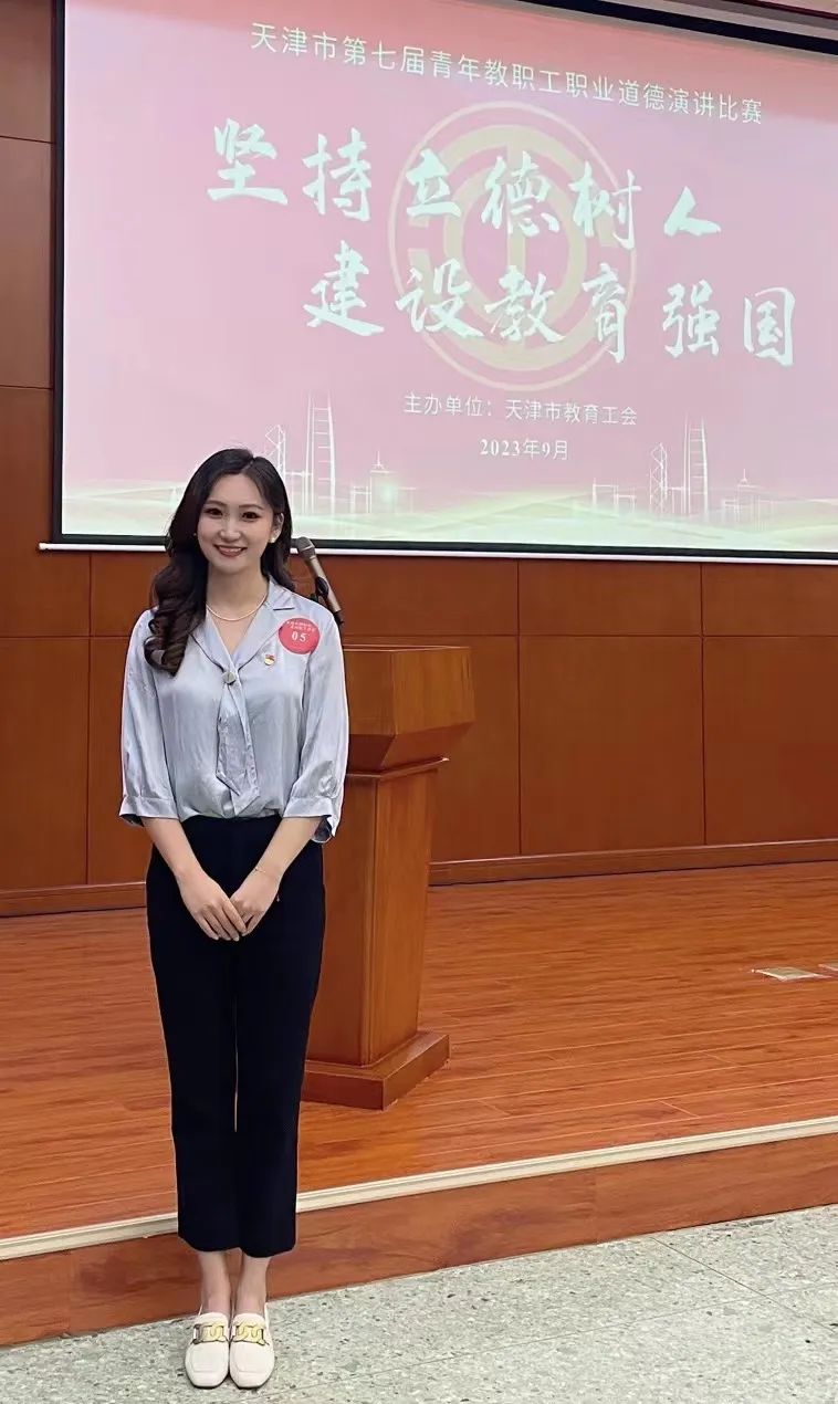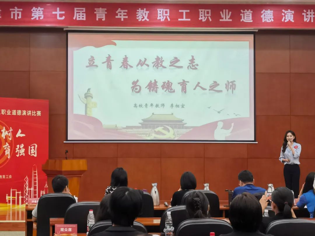 為深入學習貫徹習近平新時代中國特色社會主義思想和黨的二十大精神,大力弘揚勞模精神、工匠精神,教育引導全市廣大教職工涵養職業道德、建設教育強國,9月26日,天津市教育工會組織舉辦天津市第七屆青年教職工職業道德演講比賽,共有全市29所高校附院、16個區教育工會的44名選手參賽,我校教師李相宜代表學校參賽。經過全天九個小時的賽程,李相宜在激烈的角逐中以動人的講述風格、精湛的演講水平、出色的現場發揮斬獲一等獎。