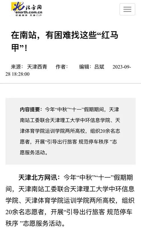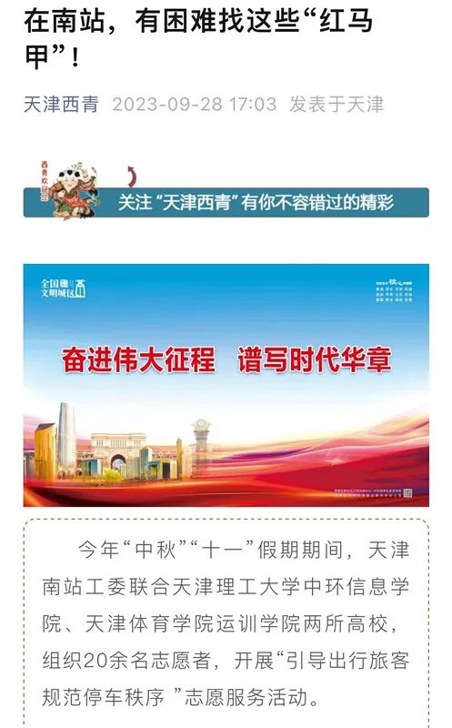 近日,我校運動訓練學院“思韻悠長、真理遠航”理論宣講團隊志愿者在天津南站開展“引導出行旅客、規范停車秩序”等志愿服務活動,助力天津“十項行動”,保障假期旅客安全出行。北方網、西青區官方微信“天津西青”對我校志愿者活動進行了報道。