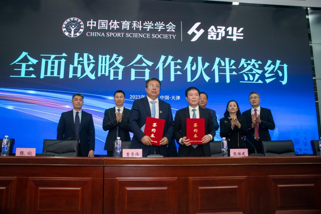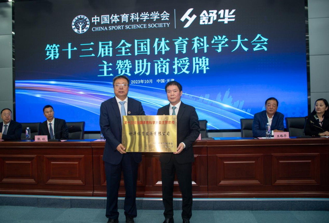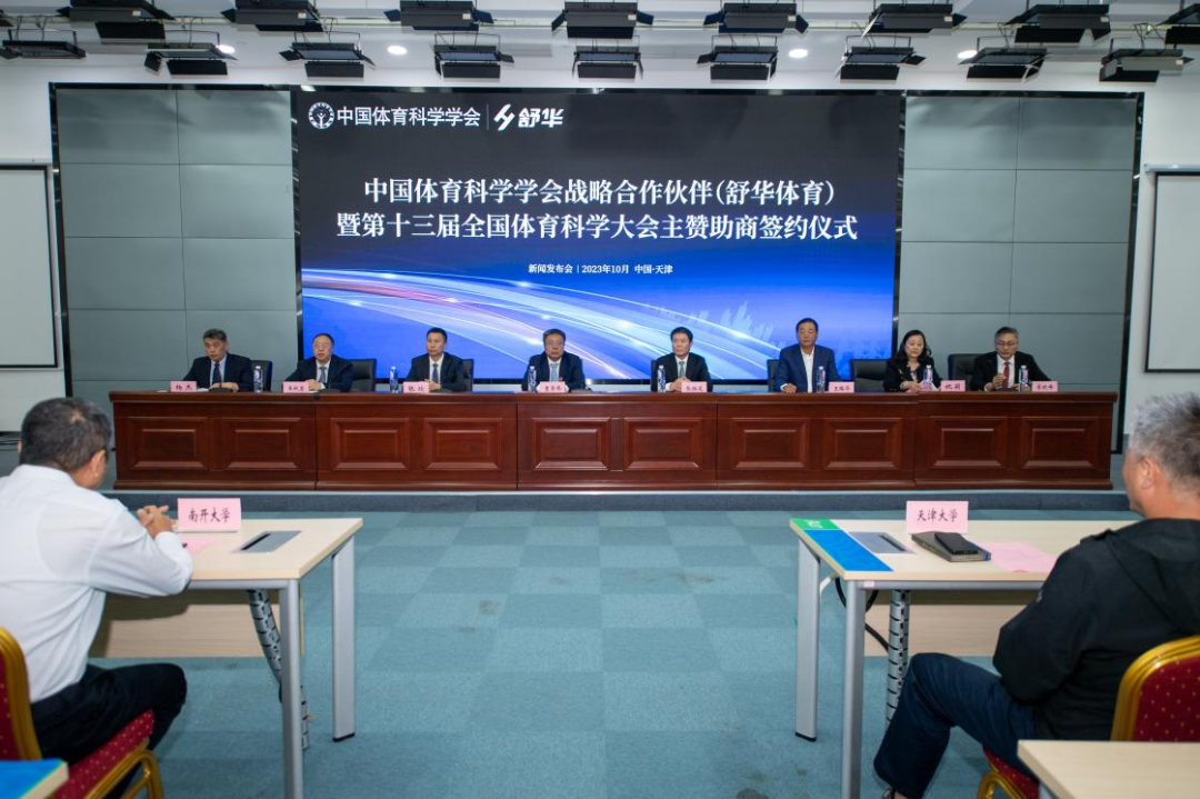 2023年10月10日,中國體育科學學會戰略合作伙伴暨第十三屆全國體育科學大會主贊助商簽約儀式在天津市體育局舉行。中國體育科學學會副理事長兼秘書長、國家體育總局體育科學研究所黨委書記、所長曹景偉,中國體育科學學會常務理事、新聞發言人祝莉,天津市體育局副局長、一級巡視員王路華,天津市委教育工委委員、市政府教育督導室總督學王秋巖,天津體育學院黨委副書記、院長張欣,舒華體育股份有限公司總裁張維建,以及南開大學、天津大學、天津師范大學、天津理工大學、天津工業大學、天津中醫藥大學、天津城建大學、天津體育職業學院的代表、嘉賓,中央、天津及有關媒體出席了發布會。發布會由中國體育科學學會常務理事、國家體育總局體育科學研究所副所長楊杰主持。