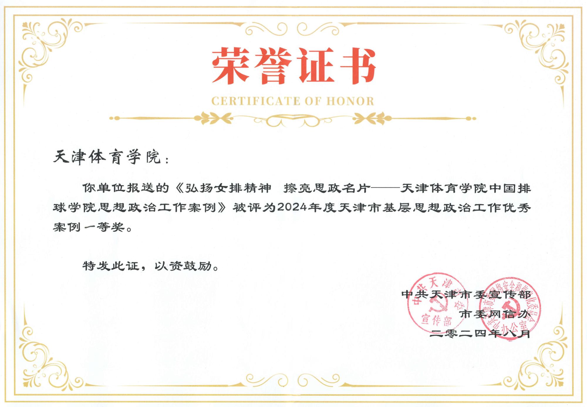 8月22日,由天津市委宣傳部和市委網信辦共同主辦的2024年天津市基層思想政治工作優秀案例評選展示活動圓滿結束。我校選送的“弘揚女排精神 擦亮思政名片——天津體育學院中國排球學院思想政治工作案例”,被評為2024年度天津市基層思想政治工作優秀案例一等獎。