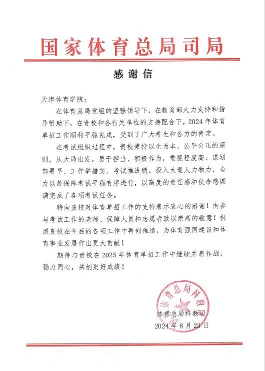 近日,國家體育總局科教司發來感謝信,對我校圓滿完成2024年體育單招工作表示肯定和感謝。