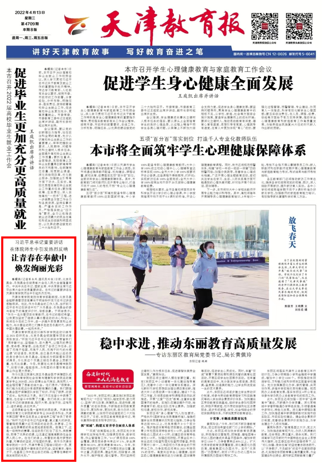 2022年4月13日,《天津教育報》頭版以“習(xí)近平總書記重要講話在體院師生中引發(fā)熱烈反響 讓青春在奉獻中煥發(fā)絢麗光彩”為題,對我校進行報道,現(xiàn)全文轉(zhuǎn)載。