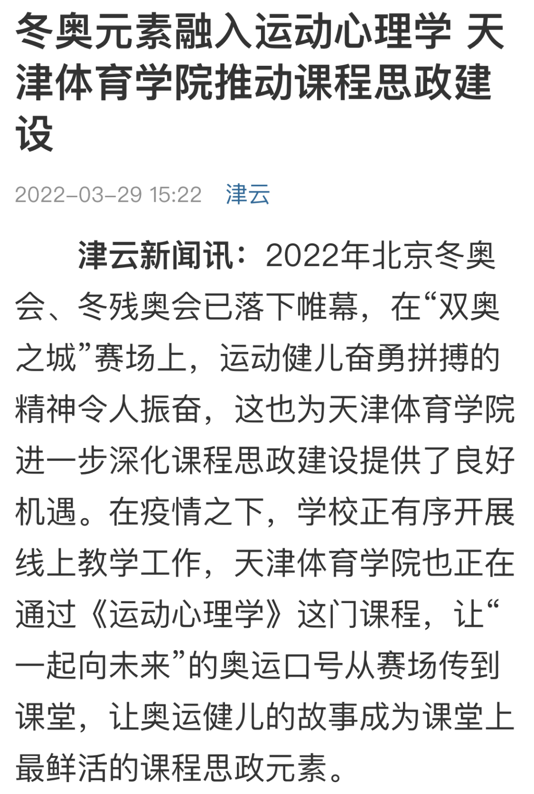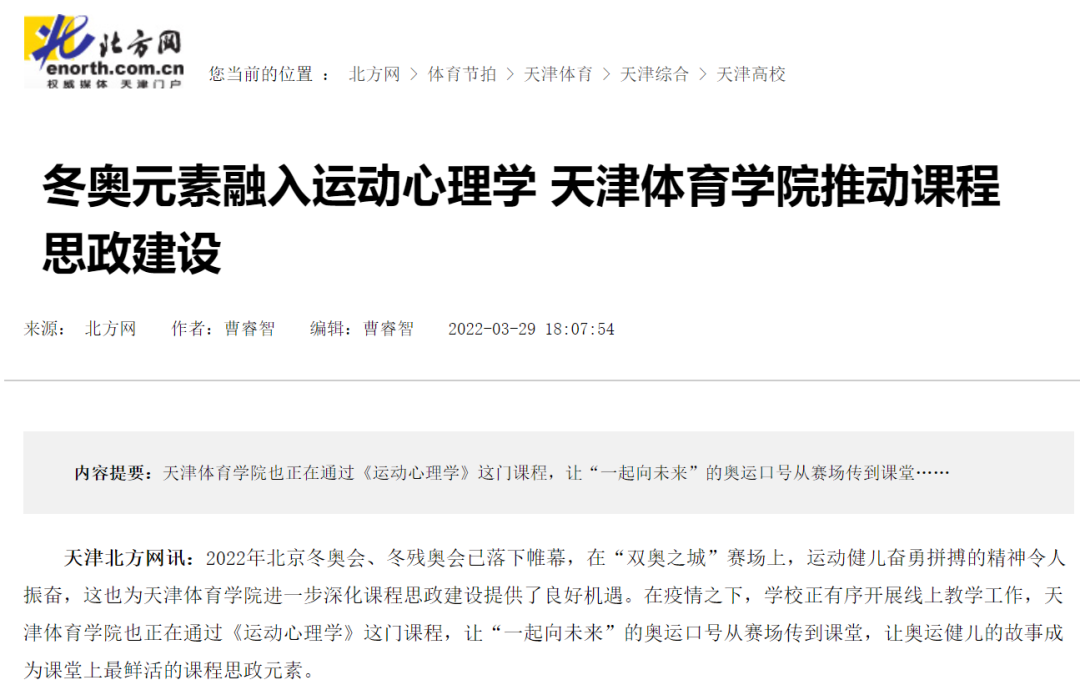 2022年3月29日,北方網(wǎng)、津云以“冬奧元素融入運(yùn)動(dòng)心理學(xué) 天津體育學(xué)院推動(dòng)課程思政建設(shè)”為題,對(duì)我校進(jìn)行報(bào)道,現(xiàn)全文轉(zhuǎn)載。