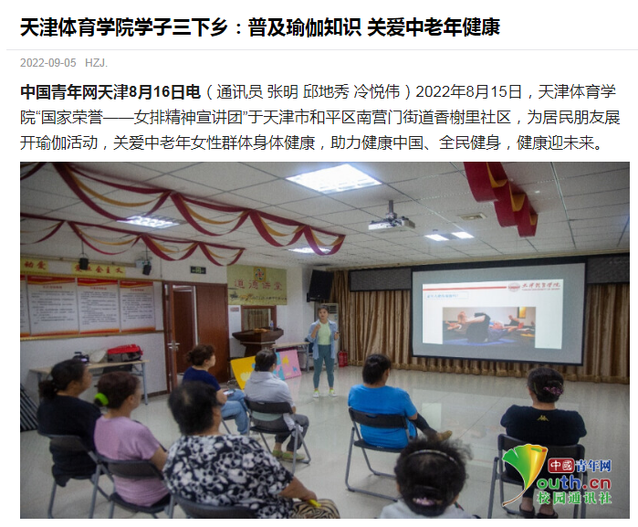 9月5日和7日,中國(guó)青年網(wǎng)分別以《天津體育學(xué)院學(xué)子三下鄉(xiāng):普及瑜伽知識(shí) 關(guān)愛(ài)中老年健康》《天津體育學(xué)院學(xué)子三下鄉(xiāng):普及排球知識(shí) 筑基體育中考》為題,持續(xù)關(guān)注報(bào)道我校學(xué)子開展“三下鄉(xiāng)”社會(huì)實(shí)踐活動(dòng)。