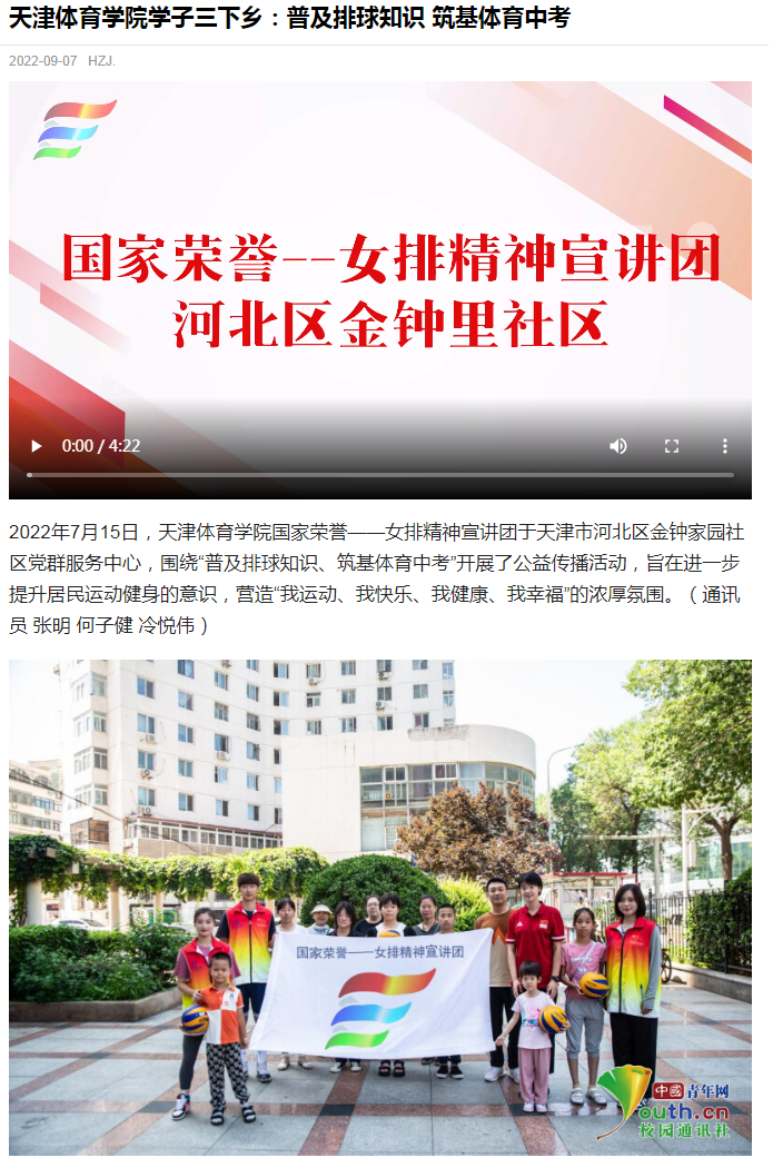 2022年7月15日,天津體育學(xué)院“國(guó)家榮譽(yù)——女排精神”宣講團(tuán)于天津市河北區(qū)金鐘家園社區(qū)黨群服務(wù)中心,圍繞“普及排球知識(shí)、筑基體育中考”開展了公益?zhèn)鞑セ顒?dòng),旨在進(jìn)一步提升居民運(yùn)動(dòng)健身的意識(shí),營(yíng)造“我運(yùn)動(dòng)、我快樂(lè)、我健康、我幸福”的濃厚氛圍。