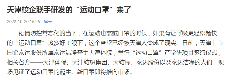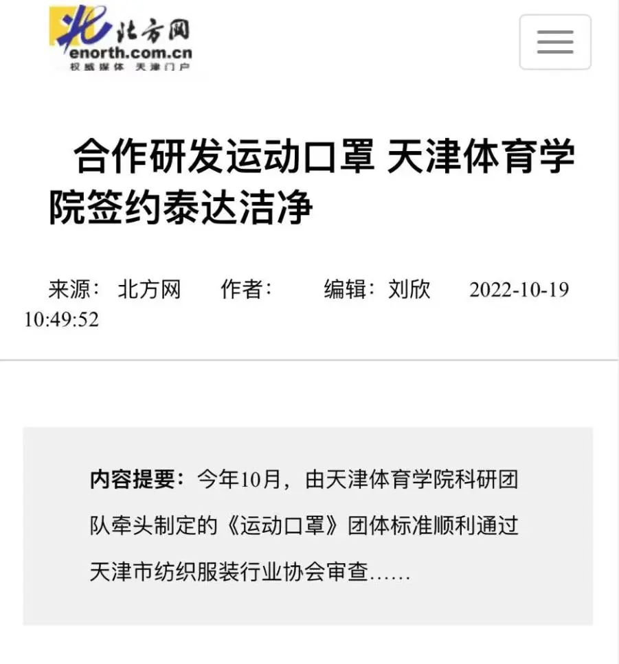 2022年10月18日,天津體育學院與天津泰達潔凈材料有限公司產學研項目簽約儀式在我校團泊校區乒羽館舉行。連日來,北方網、津云、《天津教育報》等我市主要媒體對此進行了報道。