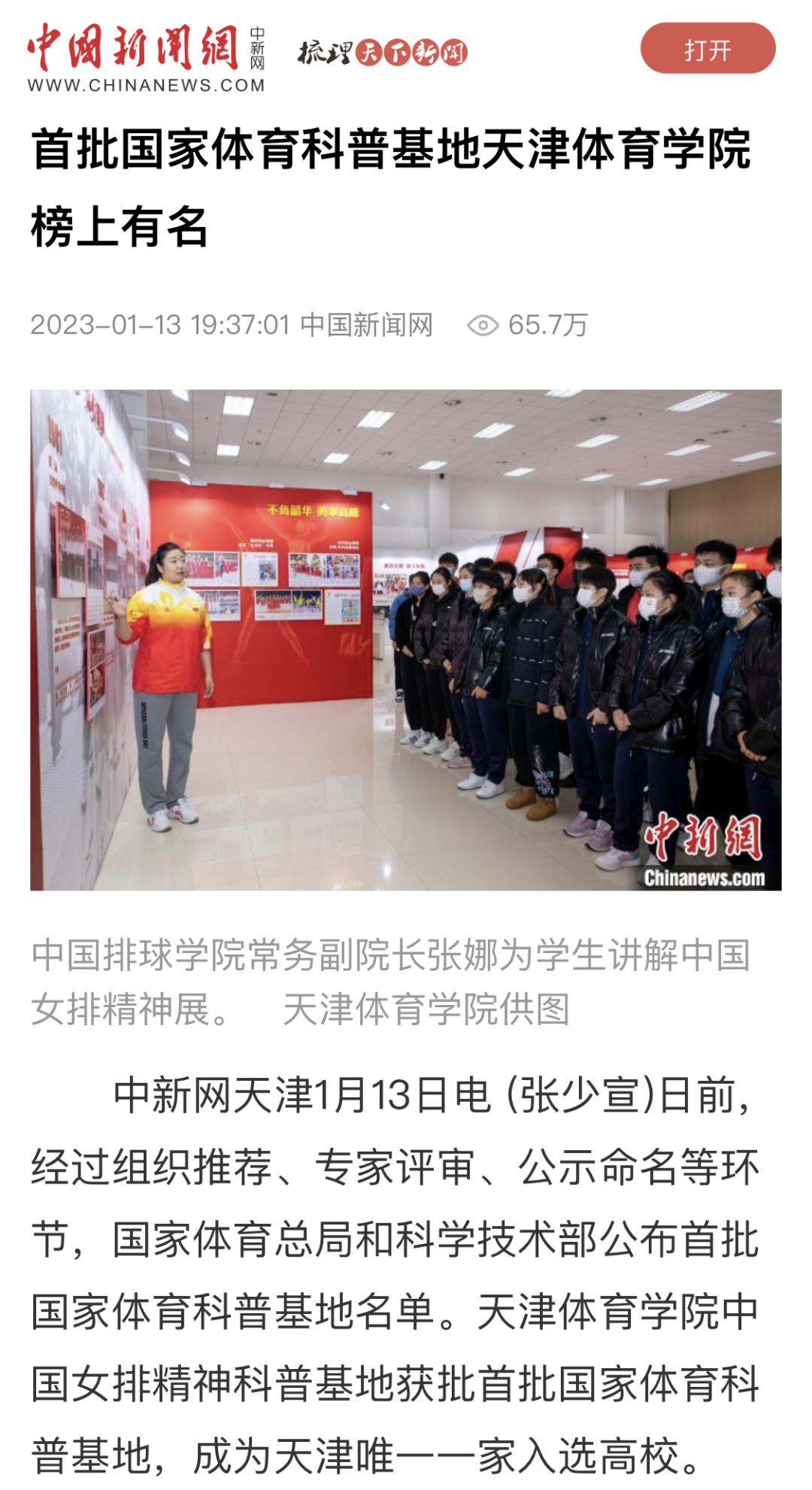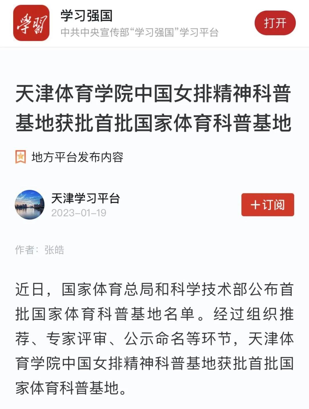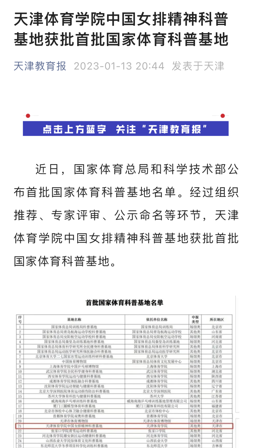 近日,國家體育總局和科學技術部公布首批國家體育科普基地名單。經過組織推薦、專家評審、公示命名等環節,我校中國女排精神科普基地獲批首批國家體育科普基地。央廣網、中國新聞網、學習強國、天津日報新媒體、津云、天津教育報新媒體等中央和我市多家媒體對此進行了報道。