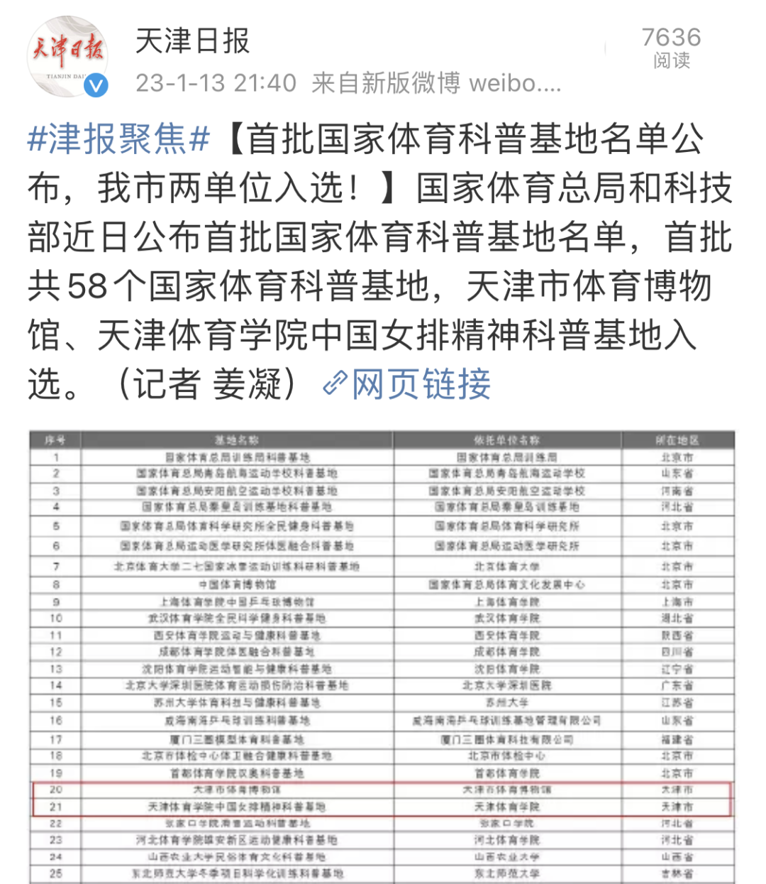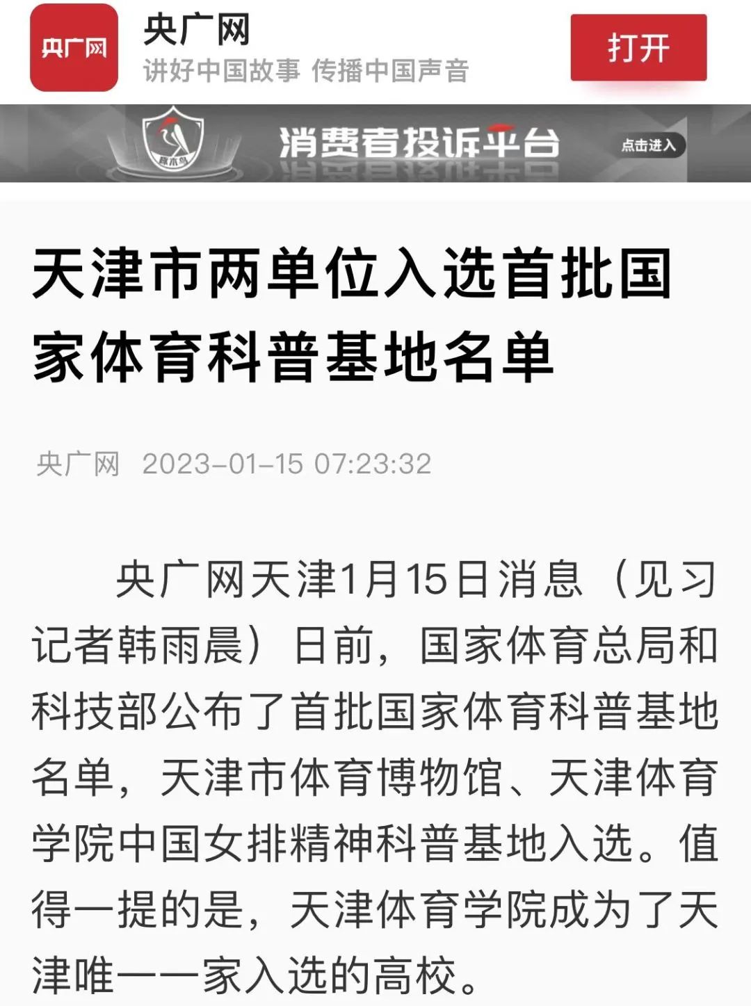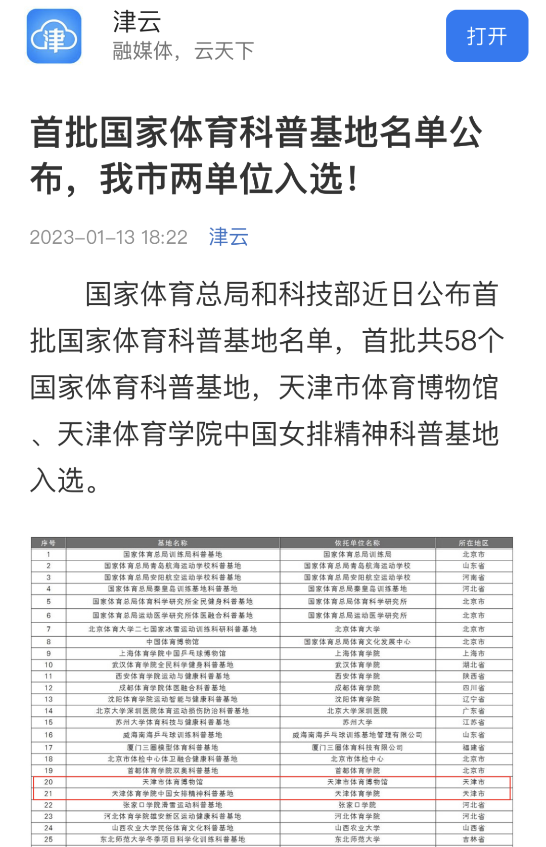 近日,國家體育總局和科學技術部公布首批國家體育科普基地名單。經過組織推薦、專家評審、公示命名等環節,我校中國女排精神科普基地獲批首批國家體育科普基地。央廣網、中國新聞網、學習強國、天津日報新媒體、津云、天津教育報新媒體等中央和我市多家媒體對此進行了報道。