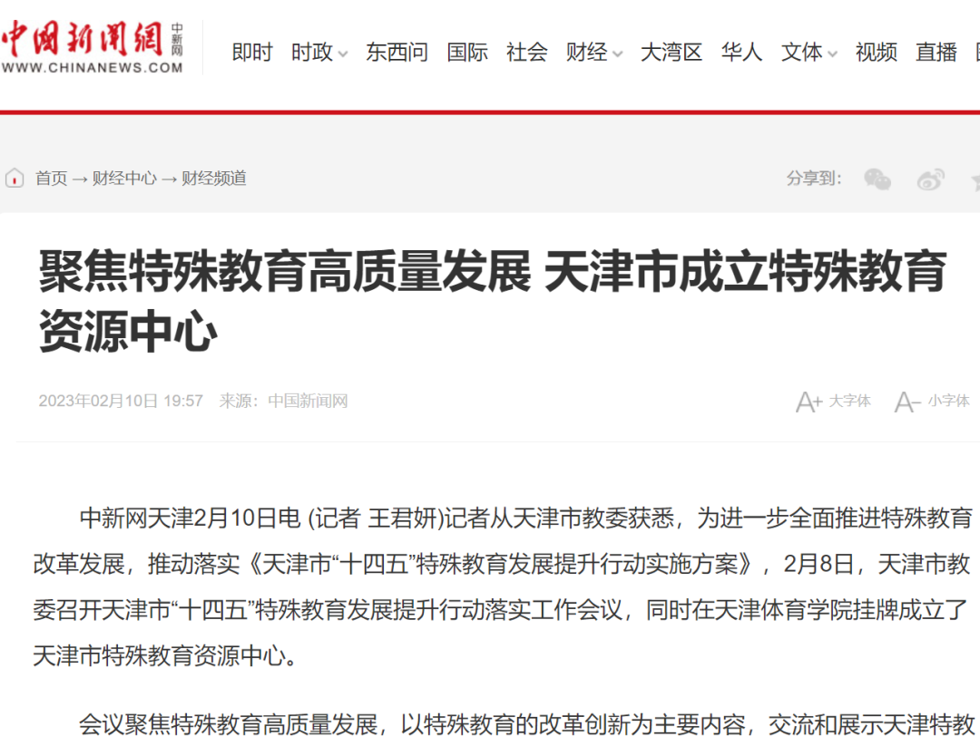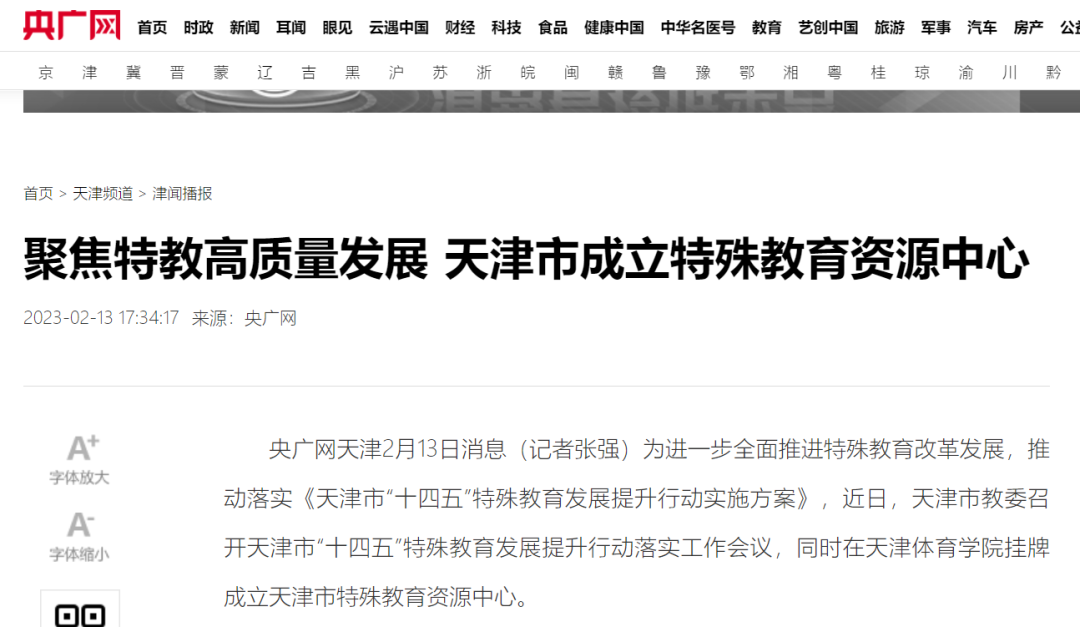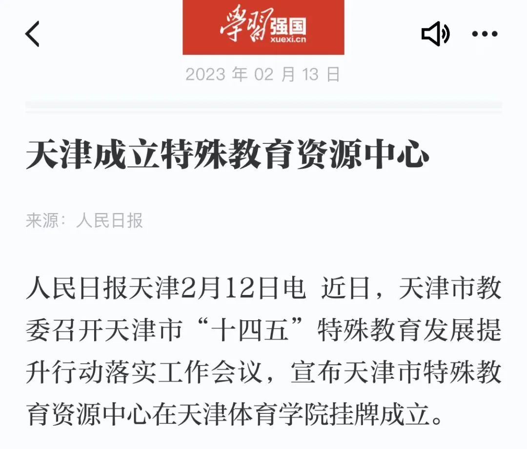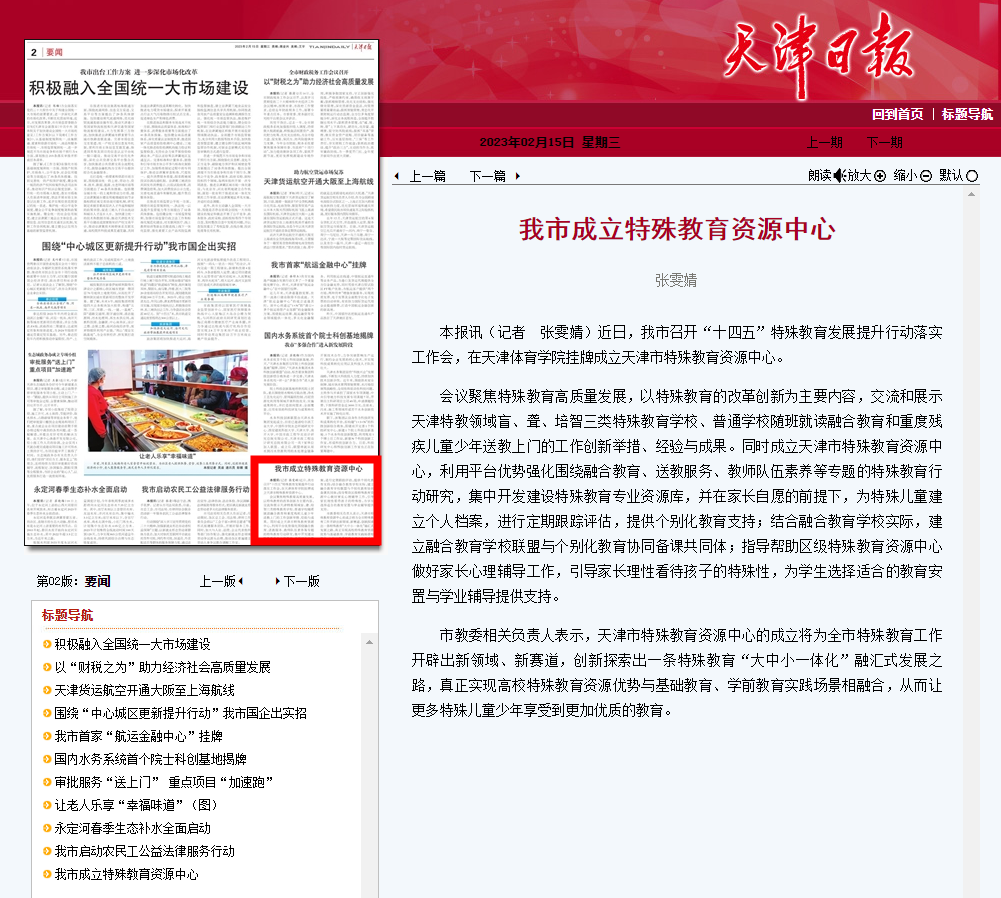 日前,天津市教委召開天津市“十四五”特殊教育發展提升行動落實工作會議,并在我校掛牌成立了天津市特殊教育資源中心。《人民日報》、新華網、央廣網、光明網、學習強國、中國新聞網、《天津日報》、津云、北方網、《天津教育報》等中央和我市多家媒體進行了報道。