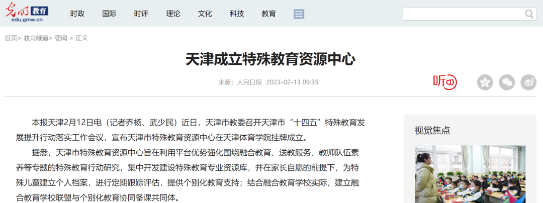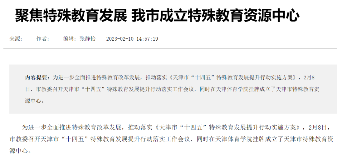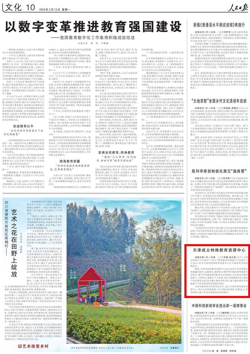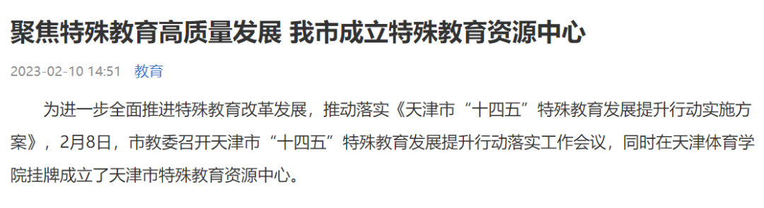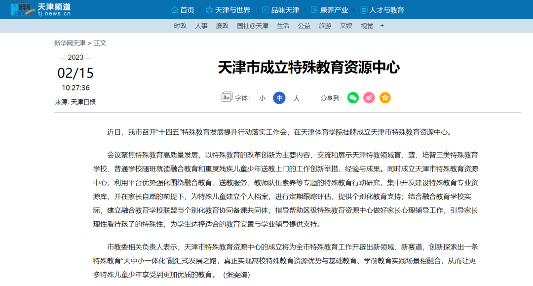 日前,天津市教委召開天津市“十四五”特殊教育發展提升行動落實工作會議,并在我校掛牌成立了天津市特殊教育資源中心。《人民日報》、新華網、央廣網、光明網、學習強國、中國新聞網、《天津日報》、津云、北方網、《天津教育報》等中央和我市多家媒體進行了報道。