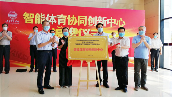 全國(guó)首家“智能體育協(xié)同創(chuàng)新中心”揭牌儀式現(xiàn)場(chǎng)(央廣網(wǎng)發(fā) 天津體育學(xué)院供圖)