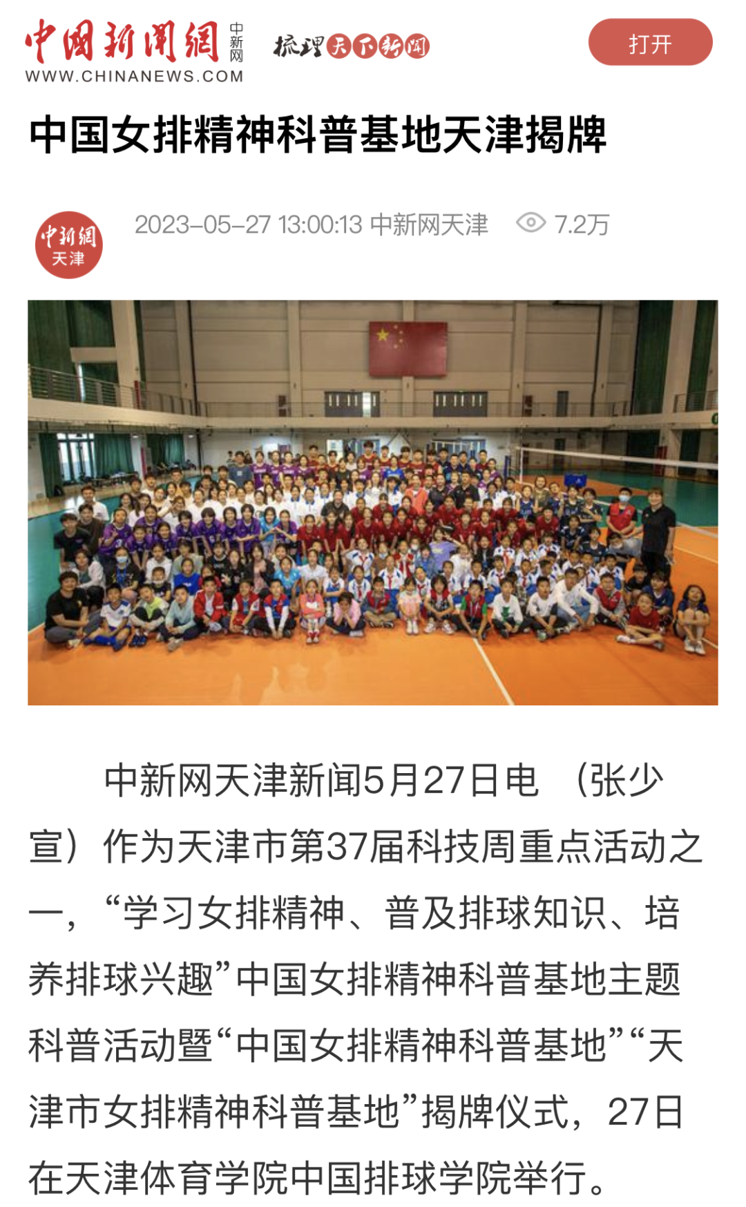 5月27日,作為天津市第37屆科技周重點(diǎn)活動(dòng)之一,“學(xué)習(xí)女排精神、普及排球知識(shí)、培養(yǎng)排球興趣”中國女排精神科普基地主題科普活動(dòng)暨“中國女排精神科普基地”“天津市女排精神科普基地”揭牌儀式,在天津體育學(xué)院中國排球?qū)W院舉行。新華網(wǎng)、中國新聞網(wǎng)、《天津日?qǐng)?bào)》、北方網(wǎng)、津云、天津教育報(bào)新媒體、天津廣播等中央和我市媒體對(duì)此進(jìn)行了報(bào)道。
