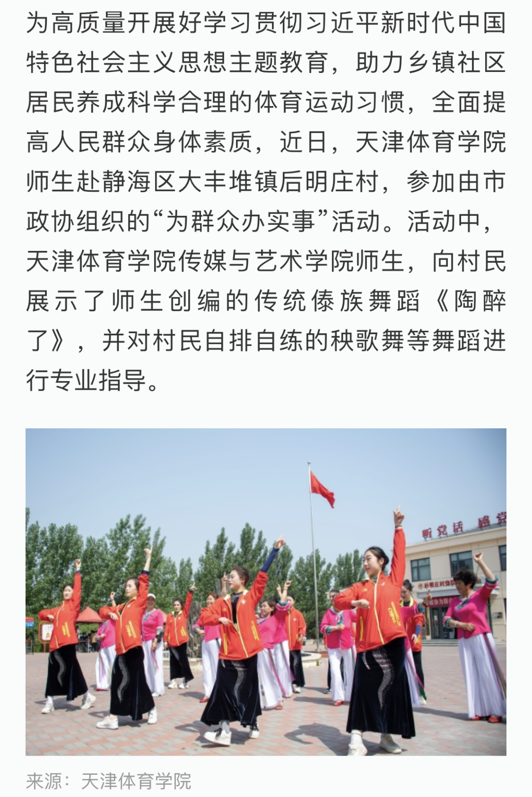 為高質(zhì)量開展好學(xué)習(xí)貫徹習(xí)近平新時(shí)代中國(guó)特色社會(huì)主義思想主題教育,助力鄉(xiāng)鎮(zhèn)社區(qū)居民養(yǎng)成科學(xué)合理的體育運(yùn)動(dòng)習(xí)慣,全面提高人民群眾身體素質(zhì),近日,天津體育學(xué)院師生赴靜海區(qū)大豐堆鎮(zhèn)后明莊村,參加由市政協(xié)組織的“為群眾辦實(shí)事”活動(dòng)。活動(dòng)中,天津體育學(xué)院傳媒與藝術(shù)學(xué)院師生,向村民展示了師生創(chuàng)編的傳統(tǒng)傣族舞蹈《陶醉了》,并對(duì)村民自排自練的秧歌舞等舞蹈進(jìn)行專業(yè)指導(dǎo)。