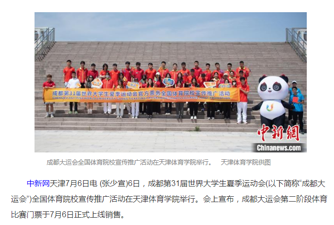 7月6日,成都第31屆世界大學生夏季運動會全國體育院校宣傳推廣活動在我校舉行。中國新聞網、天津電視臺等中央和我市媒體對此進行了報道。