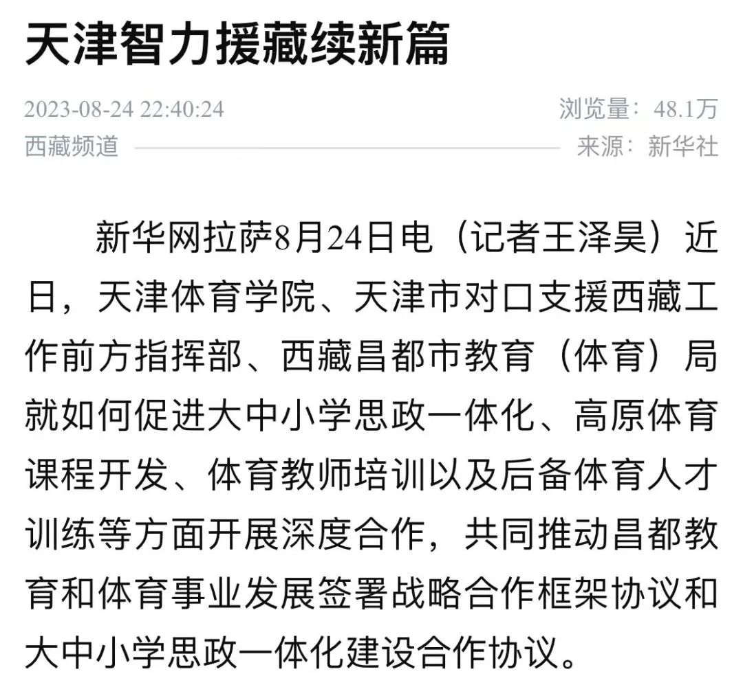 日前,新華社以“天津智力援藏續新篇”為題,報道天津體育學院、天津市對口支援西藏工作前方指揮部、西藏昌都市教育(體育)局就如何促進大中小學思政一體化、高原體育課程開發、體育教師培訓以及后備體育人才訓練等方面開展深度合作,共同推動昌都教育和體育事業發展簽署戰略合作框架協議和大中小學思政一體化建設合作協議。現全文轉載。