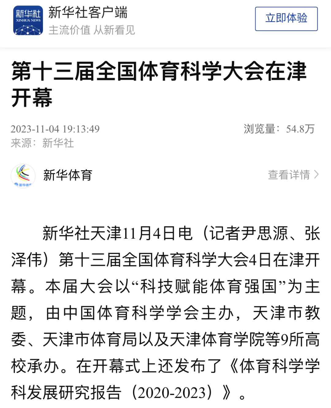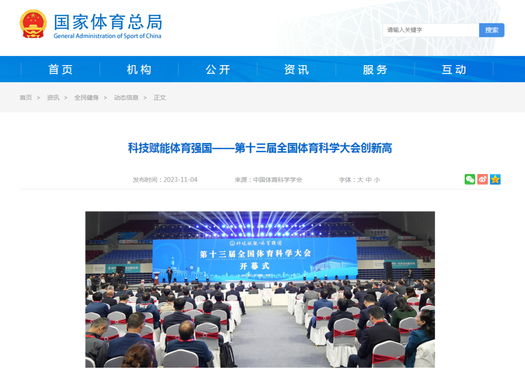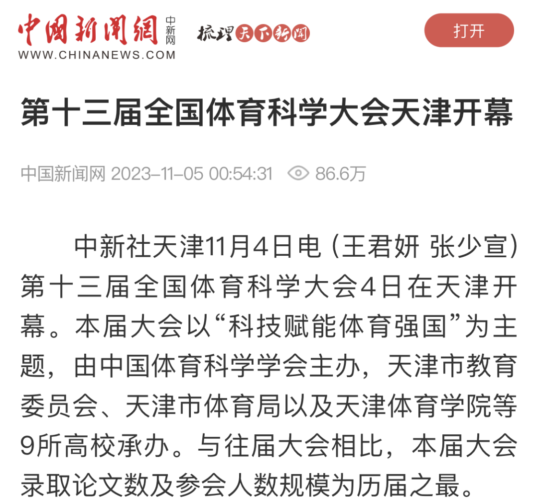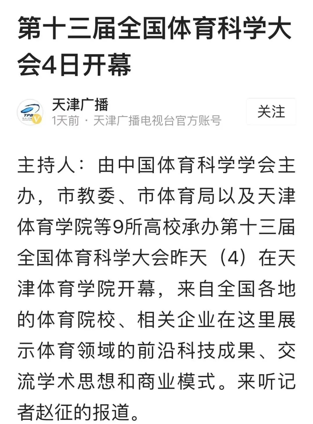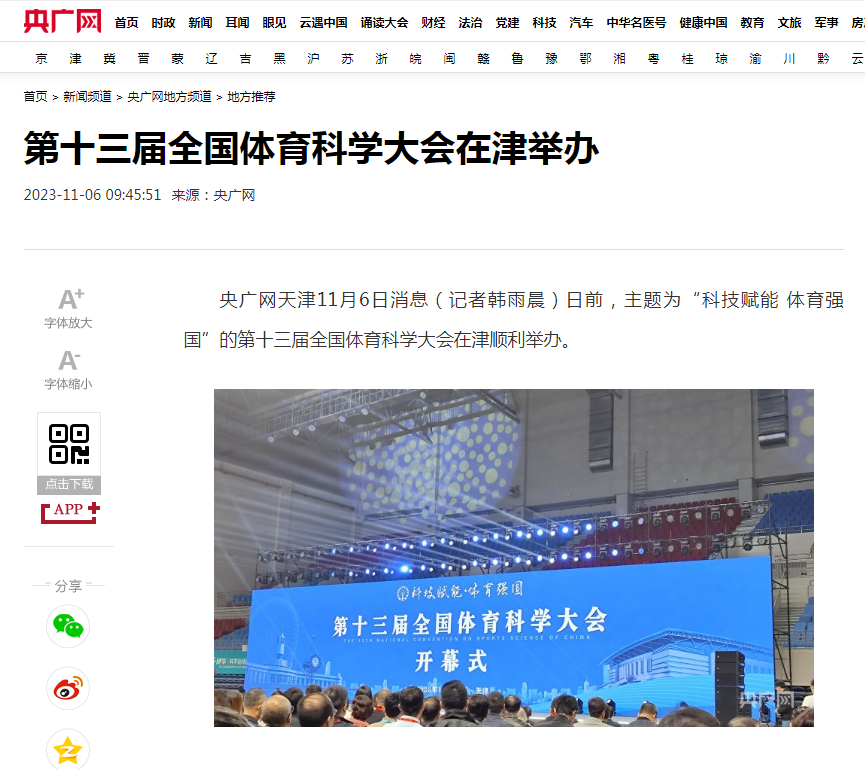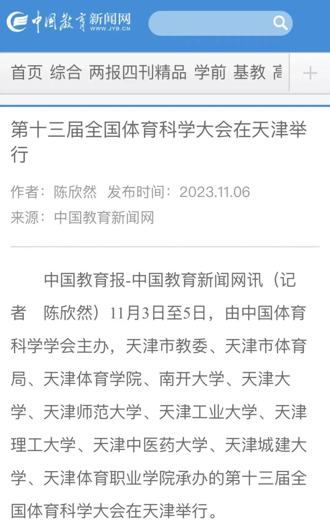 11月3日-5日,由中國體育科學學會主辦,天津市教委、天津市體育局、天津體育學院、南開大學、天津大學、天津師范大學、天津工業大學、天津理工大學、天津中醫藥大學、天津城建大學、天津體育職業學院承辦的第十三屆全國體育科學大會在天津圓滿舉行。連日來,新華社、央廣網、中國新聞網、《中國體育報》、中國教育新聞網、國家體育總局、天津電視臺、《天津日報》、津云、天津廣播等中央和我市多家媒體對此進行了報道。