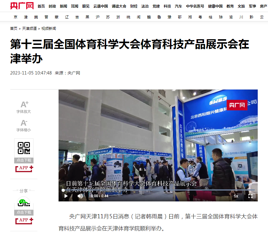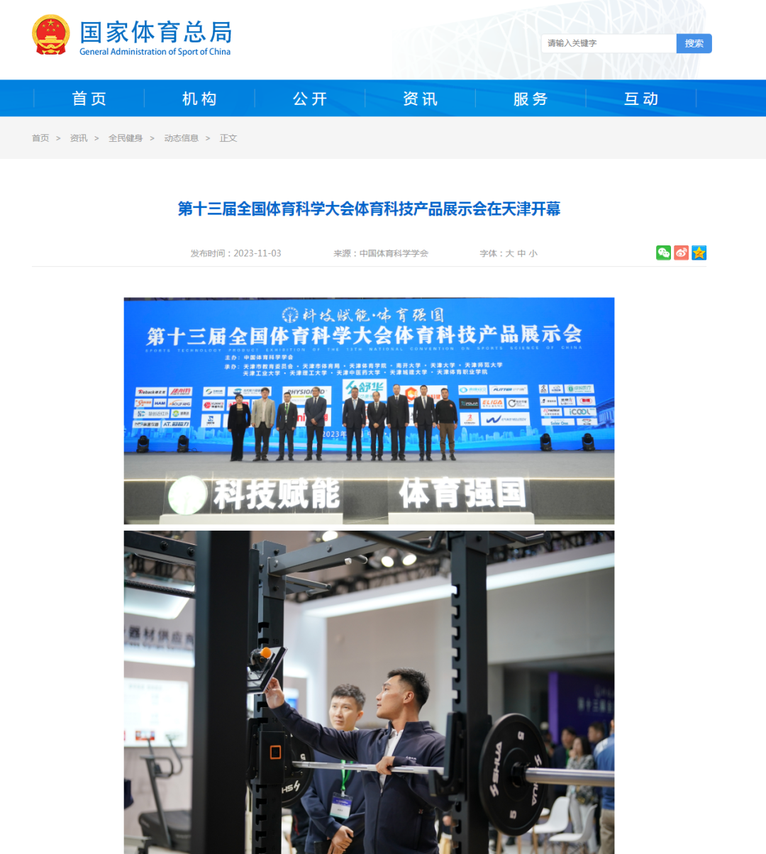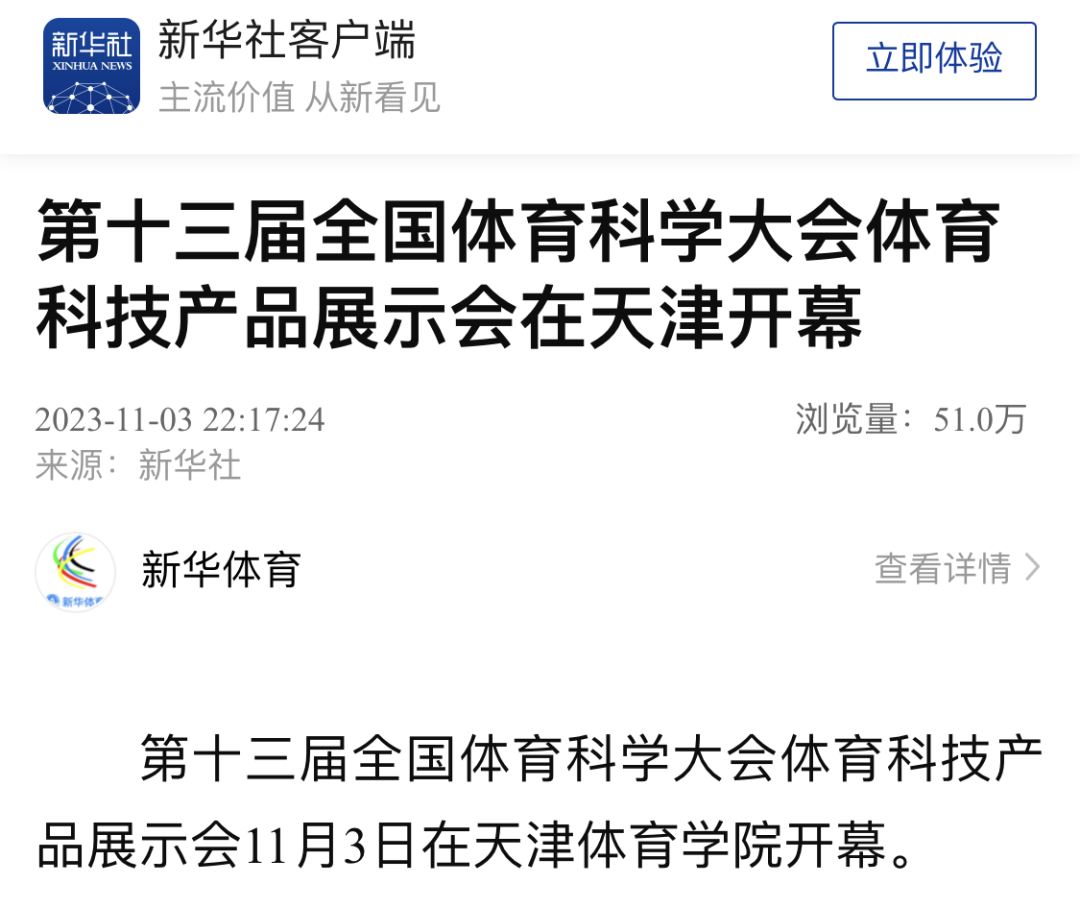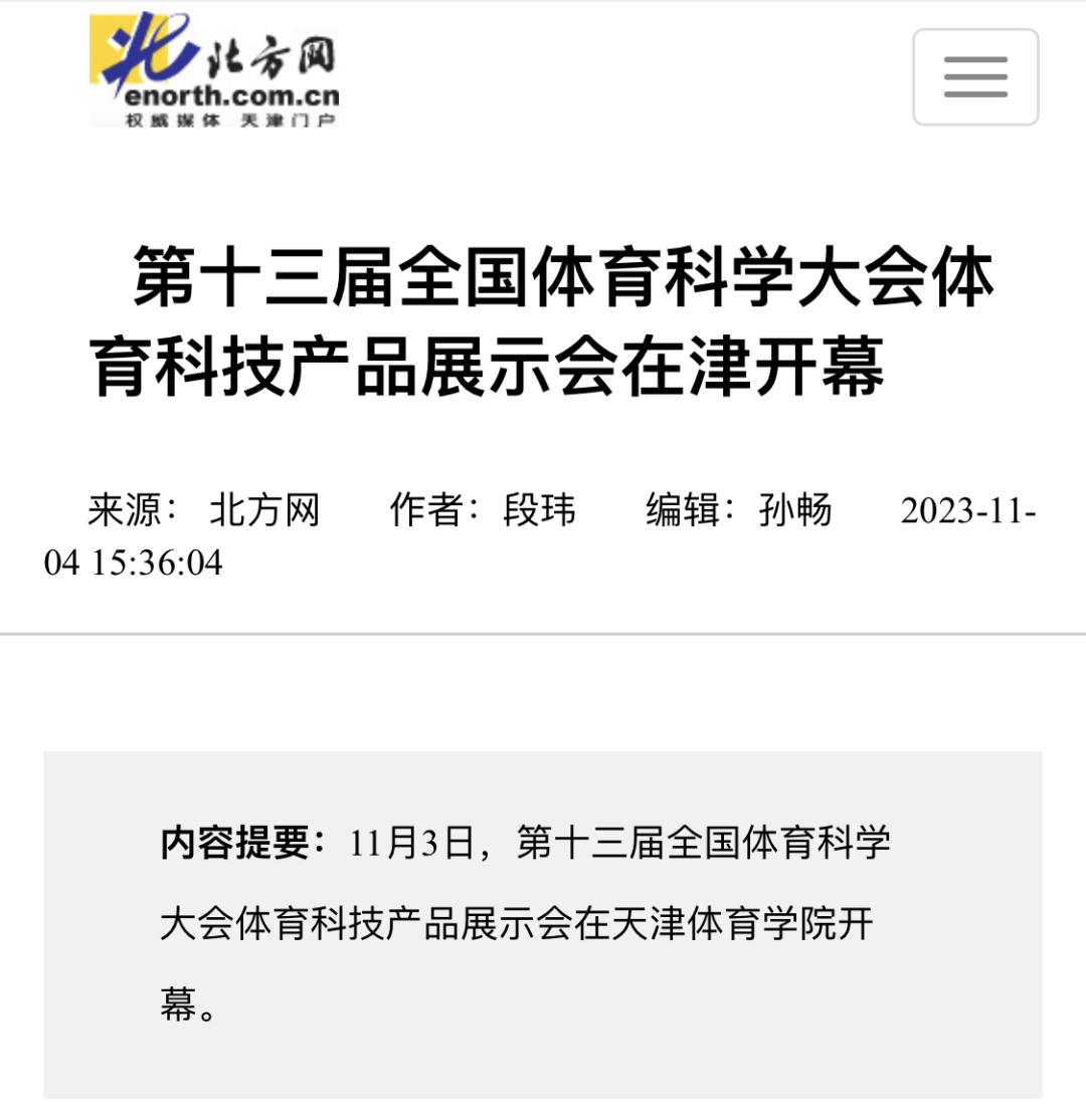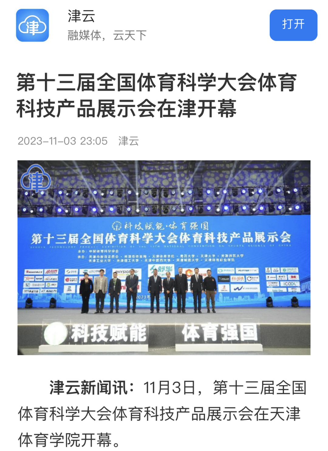 2023年11月3日下午,第十三屆全國體育科學大會體育科技產品展示會在天津體育學院隆重開幕。新華社、央廣網、國家體育總局官網、津云、北方網等中央和我市多家媒體對此進行了報道。