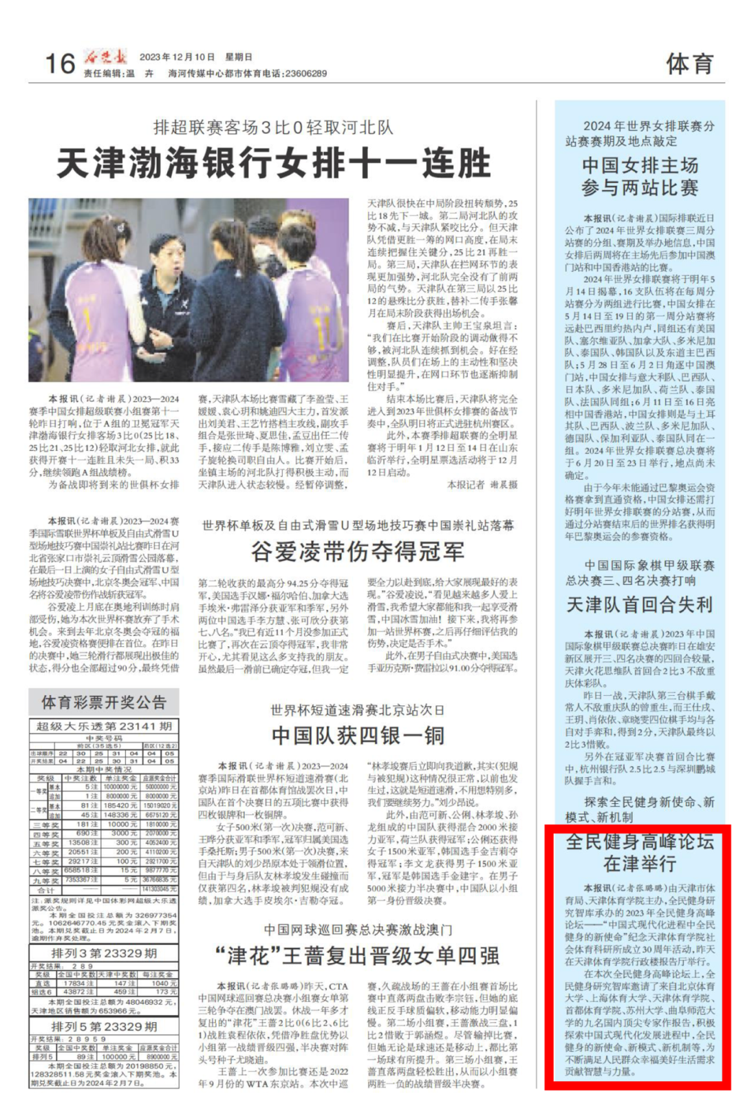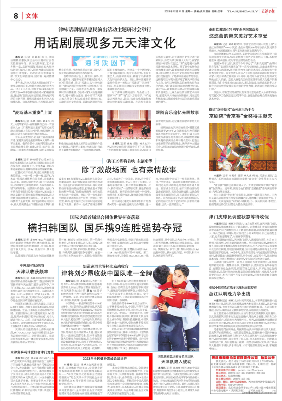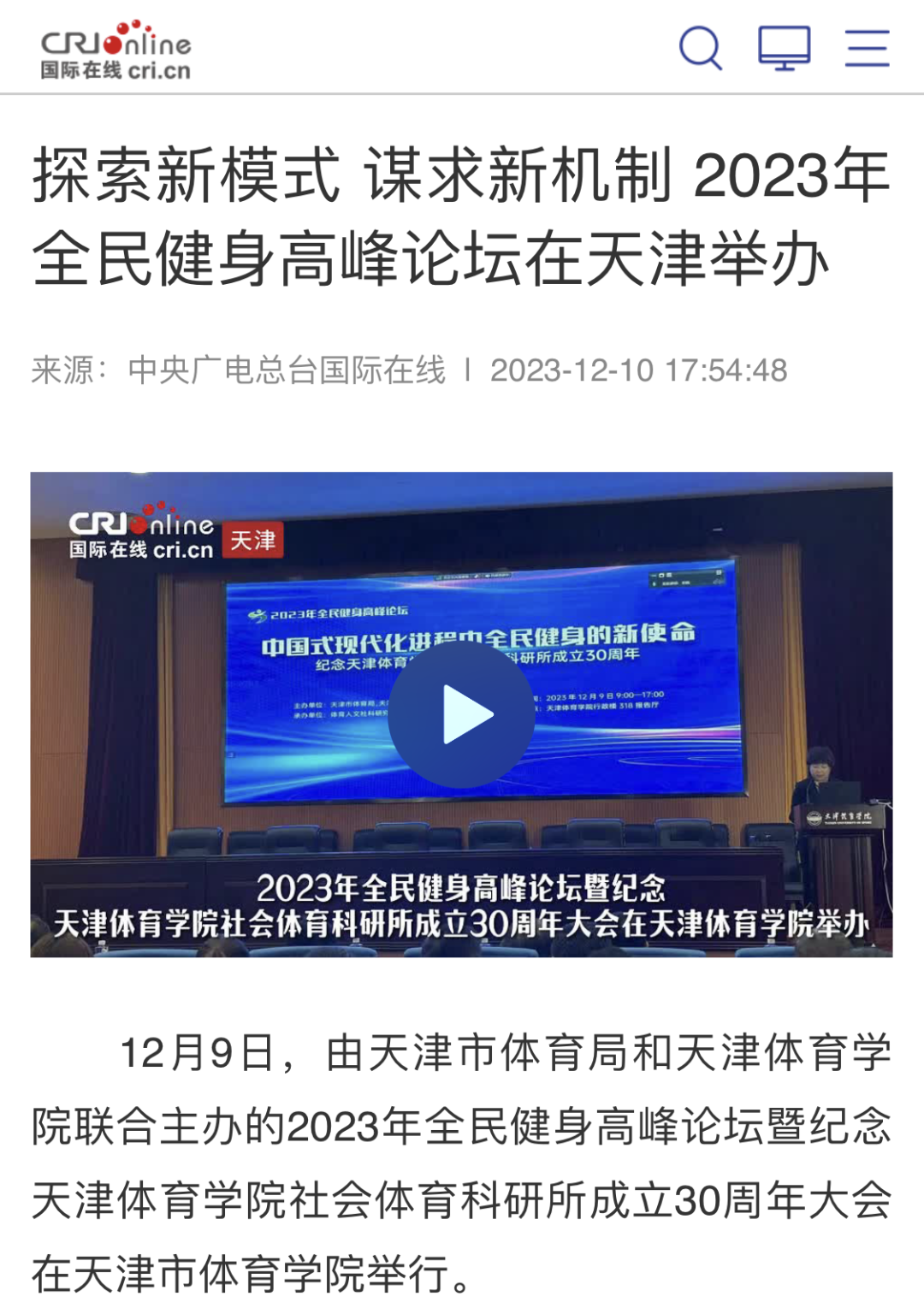 由天津市體育局、天津體育學院主辦的“中國式現(xiàn)代化進程中全民健身的新使命——紀念天津體育學院社會體育科研所成立30周年”座談會和2023年全民健身高峰論壇12月8日至9日召開。中央廣播電視總臺國際在線、《中國體育報》《天津日報》《今晚報》等中央和我市媒體對此進行了報道。