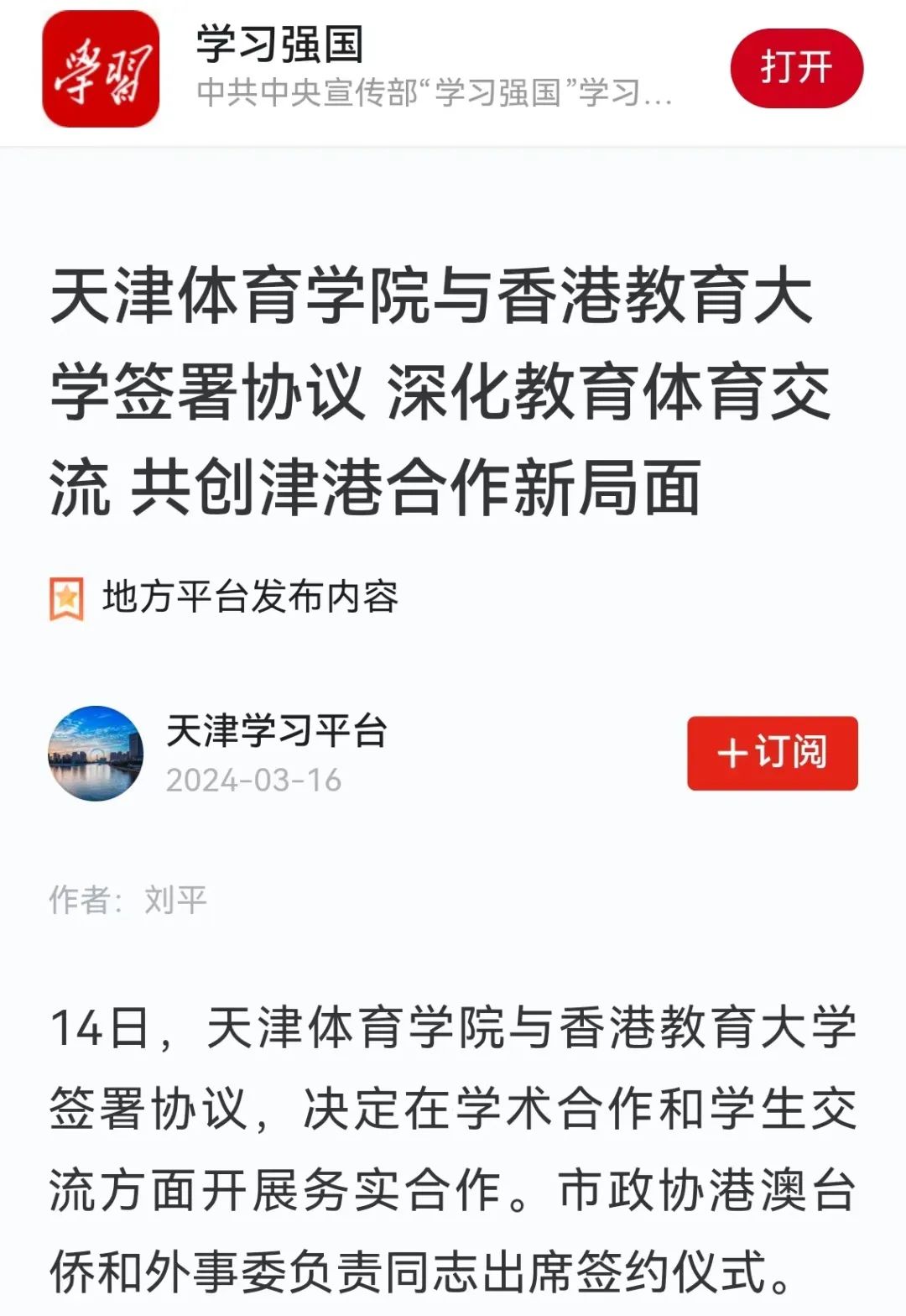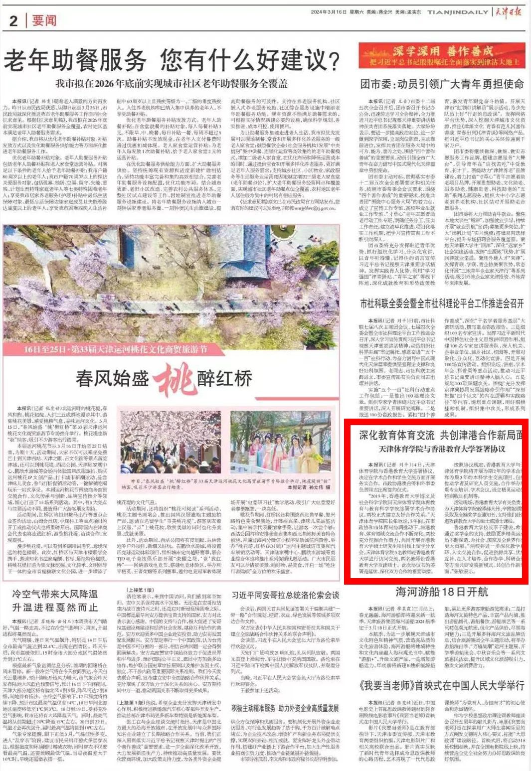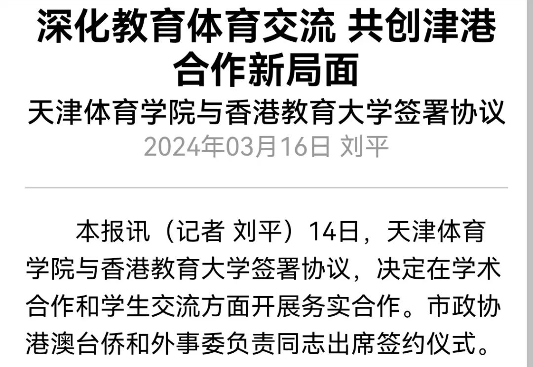 為進(jìn)一步深化對外合作交流,助力津港兩地教育高質(zhì)量發(fā)展,2024年3月14日,天津體育學(xué)院與香港教育大學(xué)學(xué)術(shù)合作及學(xué)生交流項(xiàng)目協(xié)議書簽約儀式在天津體育學(xué)院舉行。學(xué)習(xí)強(qiáng)國、《天津日報(bào)》、津云等多家媒體對此進(jìn)行了報(bào)道。
