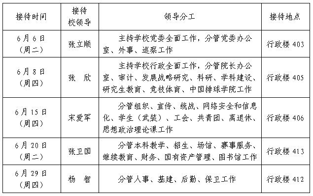 根據《天津體育學院領導干部接待日制度》規定及學校近期工作安排,現將2023年6月校領導接待師生來訪安排通知如下: