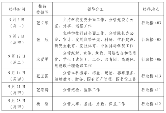 根據《天津體育學院領導干部接待日制度》規定及學校近期工作安排,現將2023年9月校領導接待師生來訪安排通知如下:相關事項: