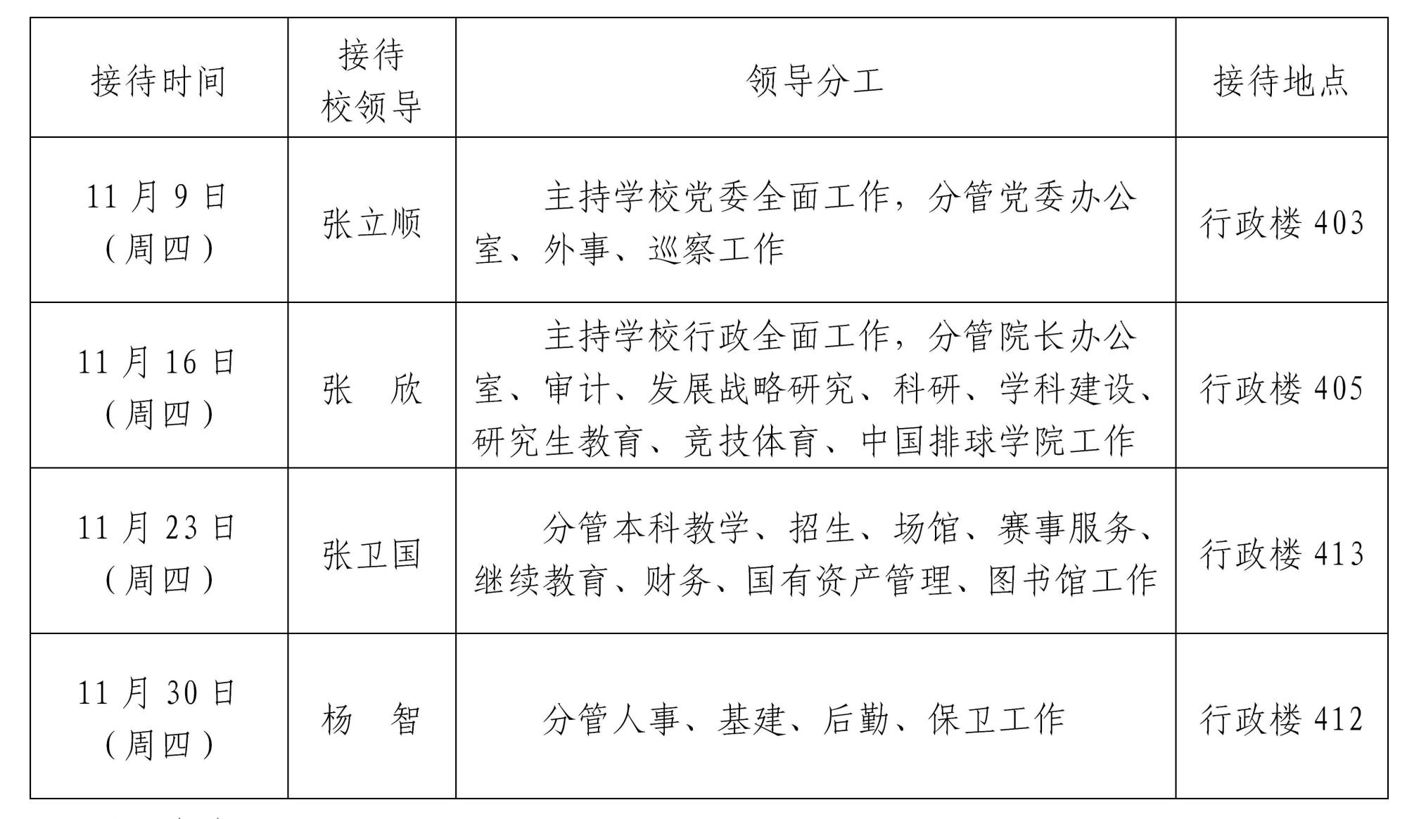 根據《天津體育學院領導干部接待日制度》規定及學校近期工作安排,現將2023年11月校領導接待師生來訪安排通知如下: