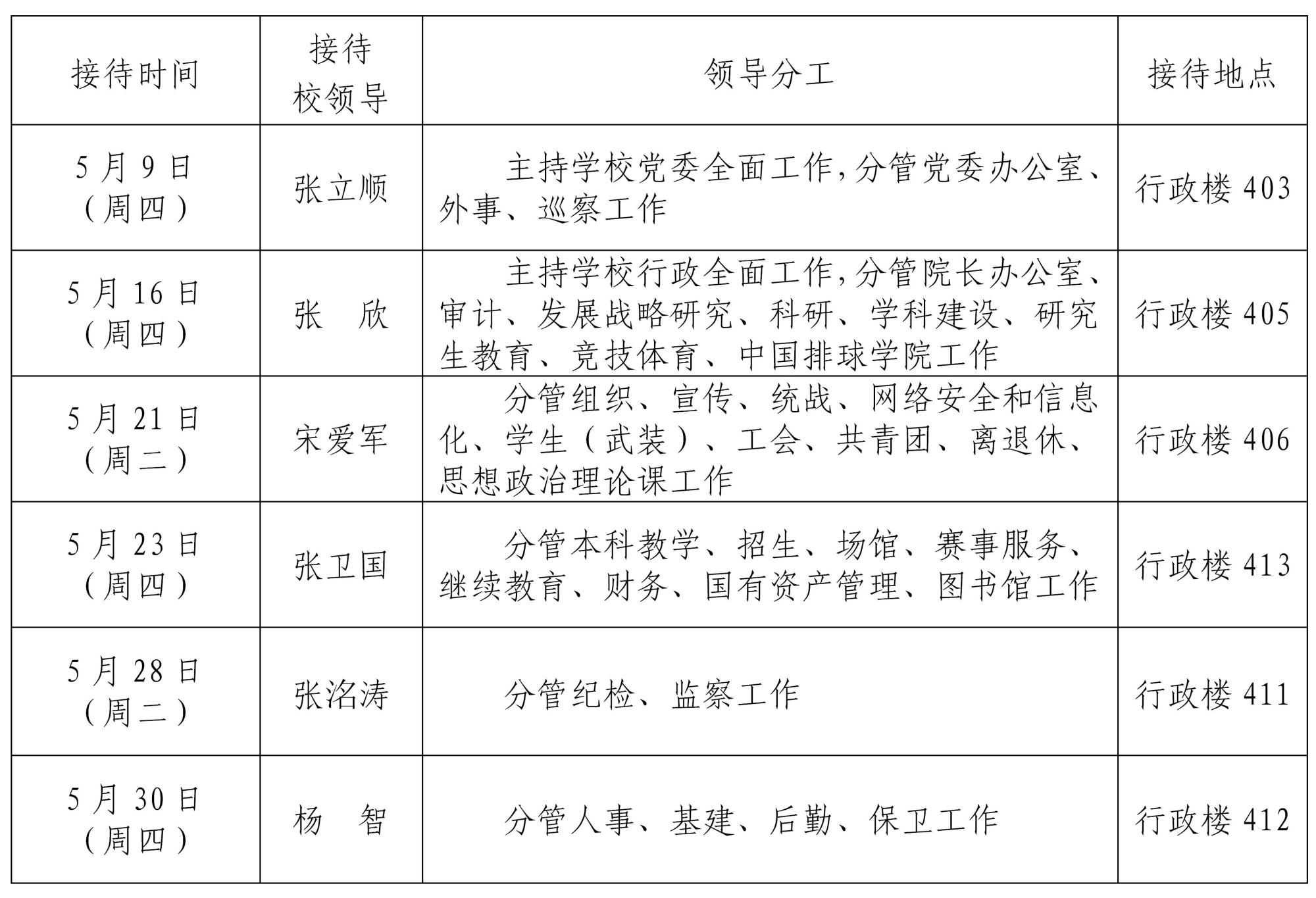 根據《天津體育學院領導干部接待日制度》規定及學校近期工作安排,現將2024年5月校領導接待師生來訪安排通知如下: