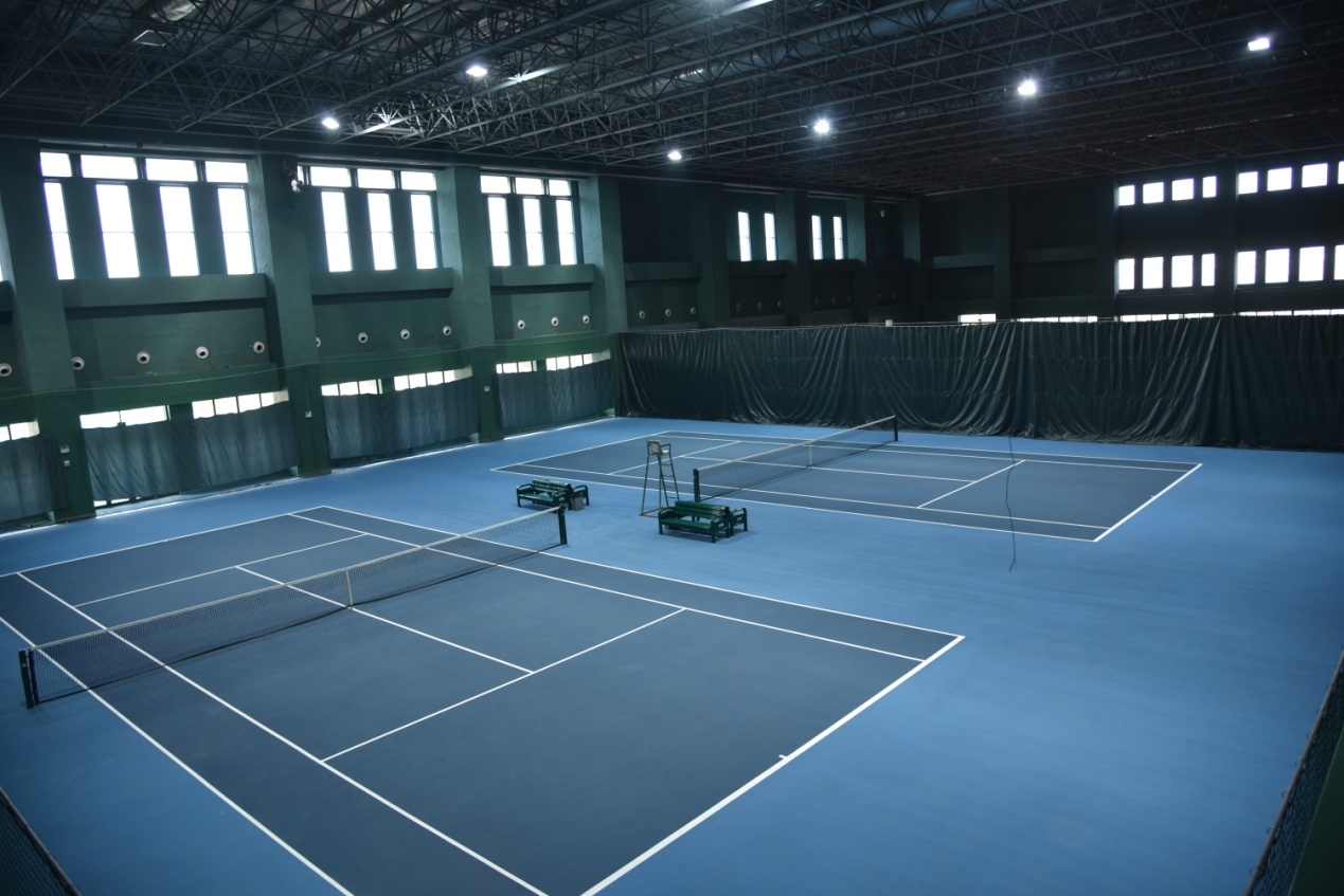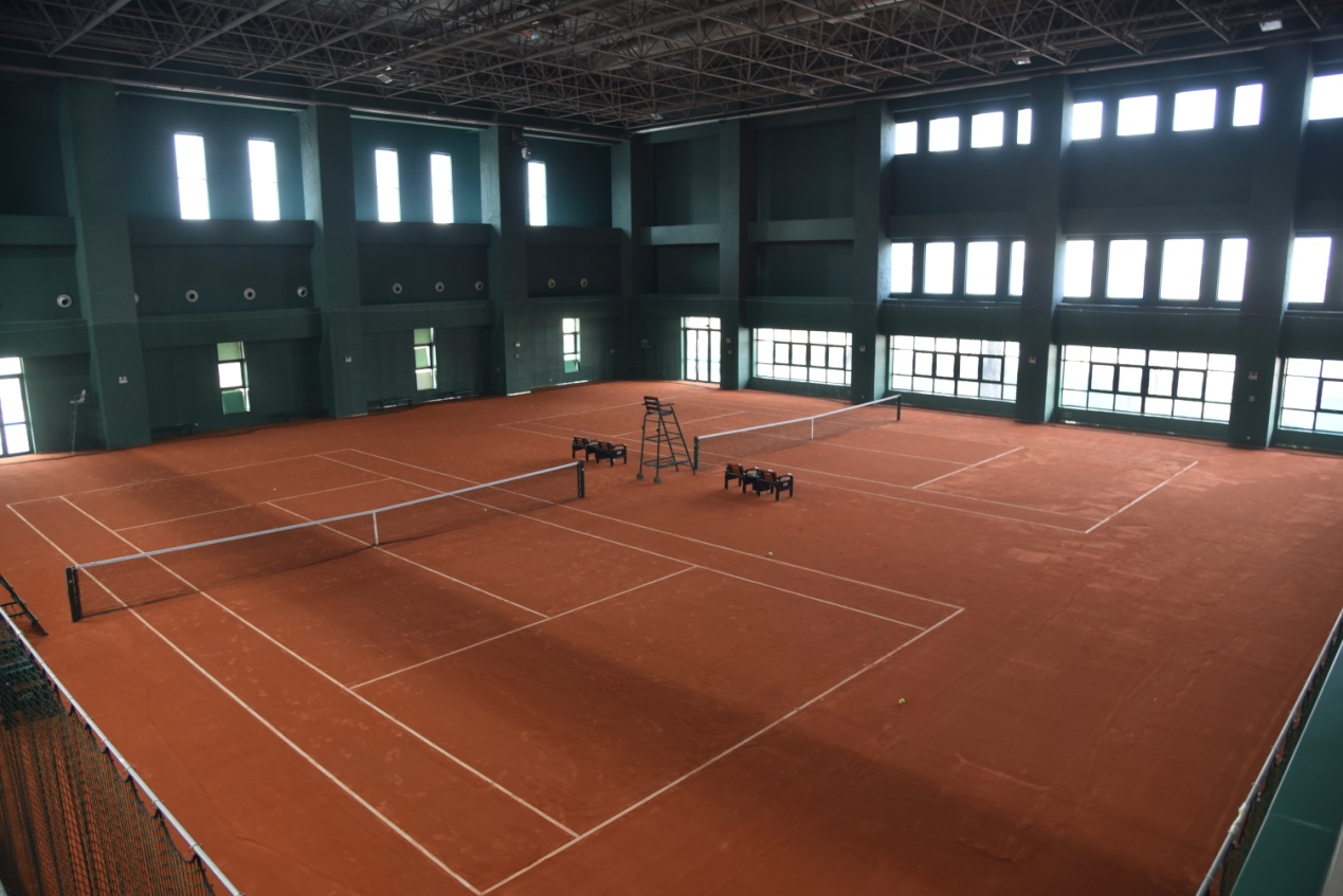 網(wǎng)球館建筑面積11516平方米,場地面積5978平方米,共8片標準場地,其中有6片塑膠場地、2片紅土場地,館內(nèi)有良好的燈光照明、暖氣、空調(diào)設備設施齊全,附屬設施包括:貴賓室、淋浴室等,可承接各類網(wǎng)球項目比賽。
